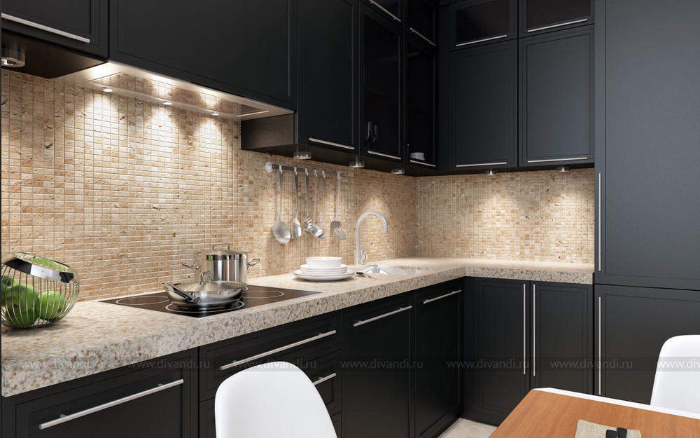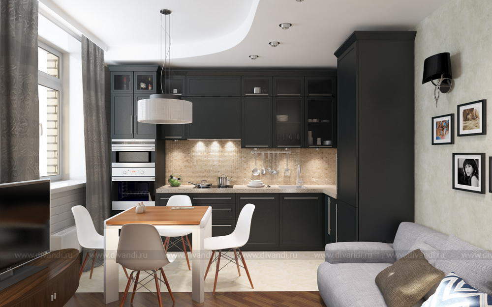 Квартира для молодой семьи. Минималистичный интерьер облагораживают элементы легкой строгой классики, кухня из темного дерева, витражное фальш-окно, глянцевые поверхности мебели в спальне контрастируют с мягким ковровым покрытием.
