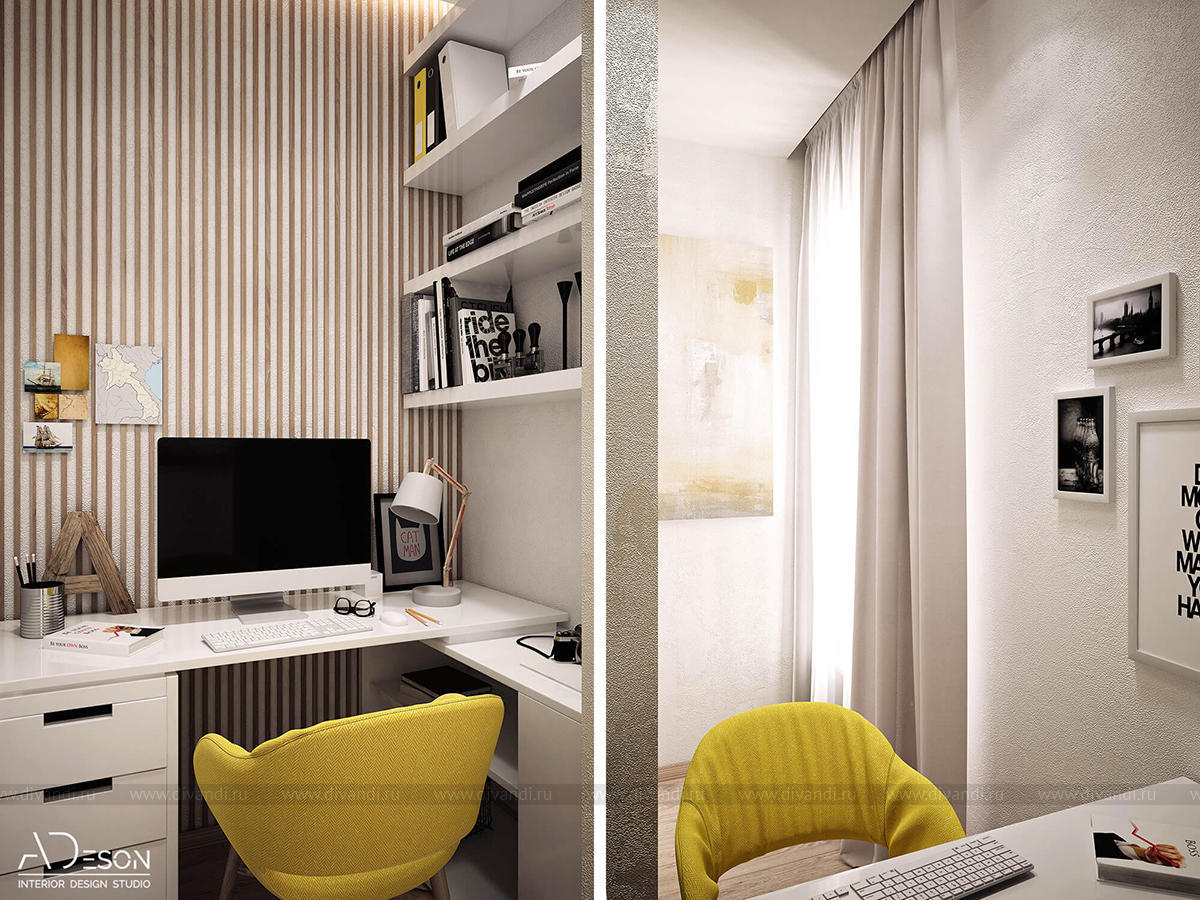 Кухня-гостиная в двухкомнатной квартире в г. Первоуральске для молодой семьи с ребенком. Нам также удалось разместить в этом пространстве маленький кабинет для главы семьи.
