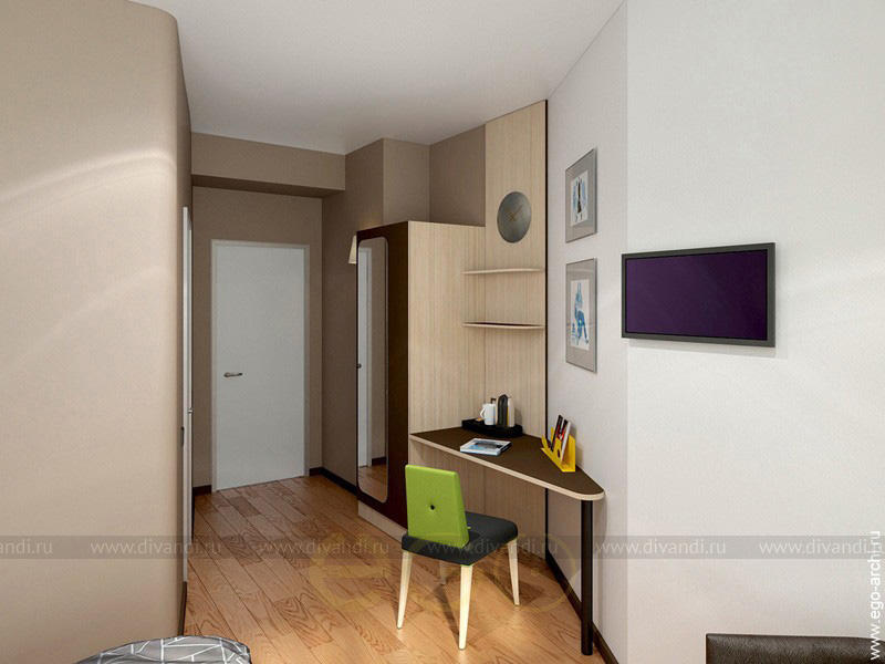 Мы выбрали современный стиль интерьера, такой, который создает впечатление качестенного сетевого отеля (как All Seasons, например). Ведь главное в отеле - это удобство, комфорт и стиль. На стенах используется покраска, в 2-3 цвета - это отличное решение для жилых интерьеров, и довольно бюджетно.
