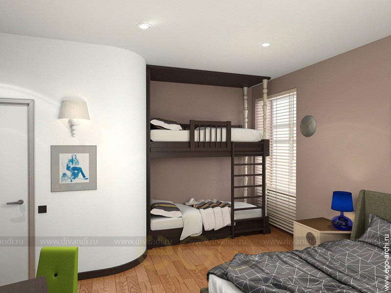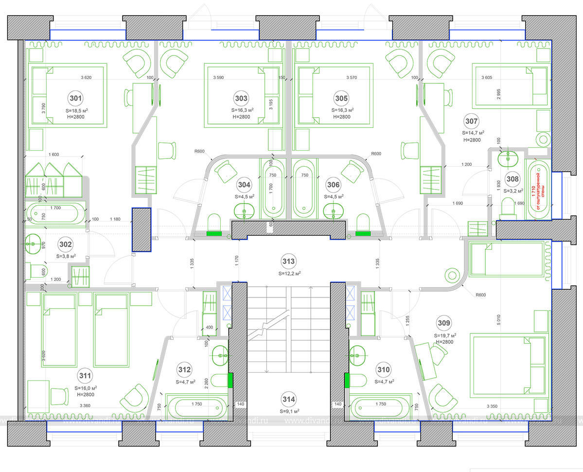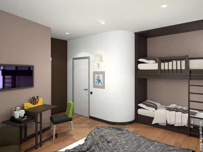 Так же мы целенаправленно сделали ниши в стенах между номерами - это позволяет удобно разместить письменные столы, увеличив пространство номера.