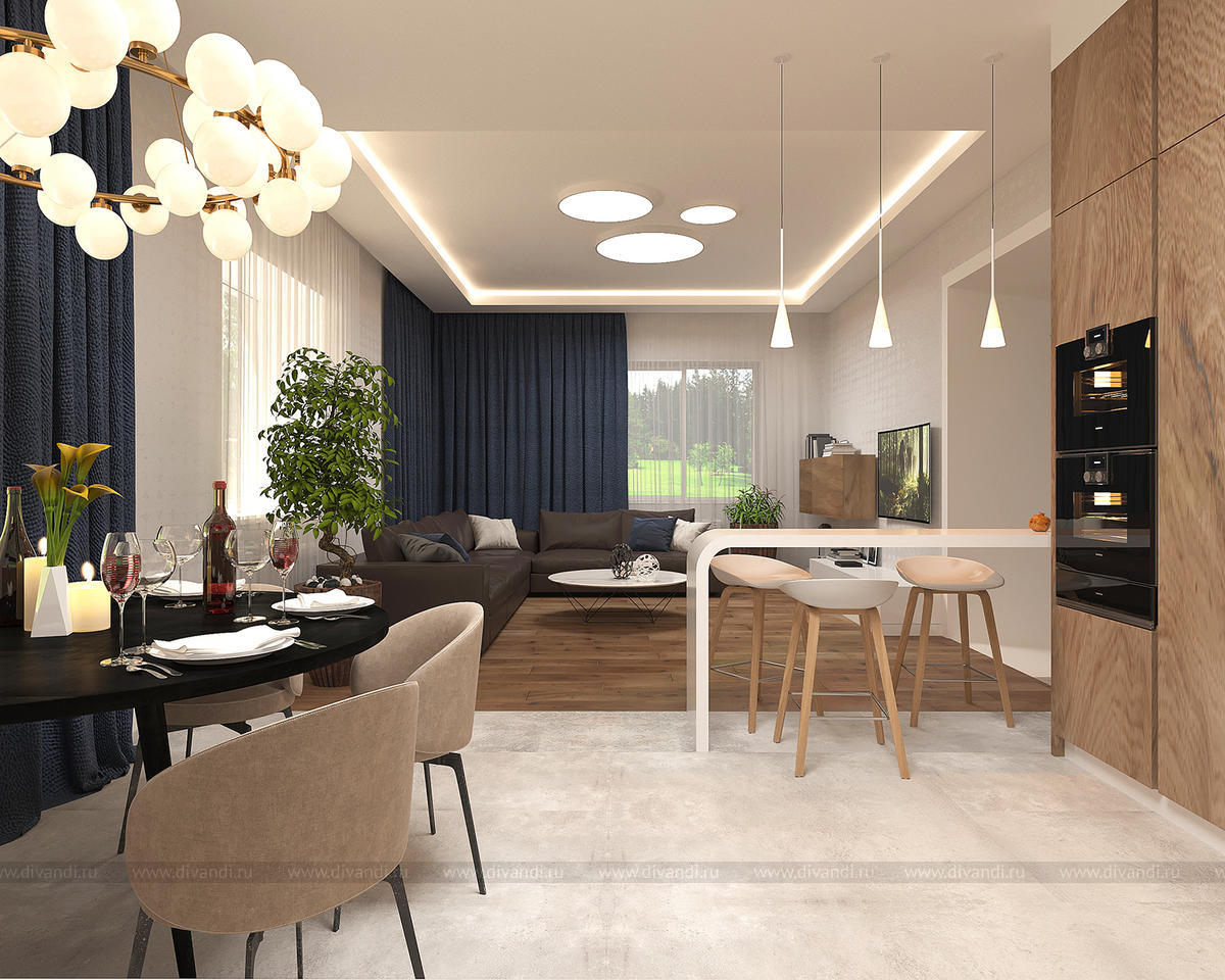 Дизайн проект гостиной в загородном доме. Екатеринбург. Сочетание трех главных элементов: натуральная структура и цвет дерева, сочный синий цвет, а для контраста и усиления эффекта первых двух компонентов - ярко белый цвет стен и потертый серый бетон на полу