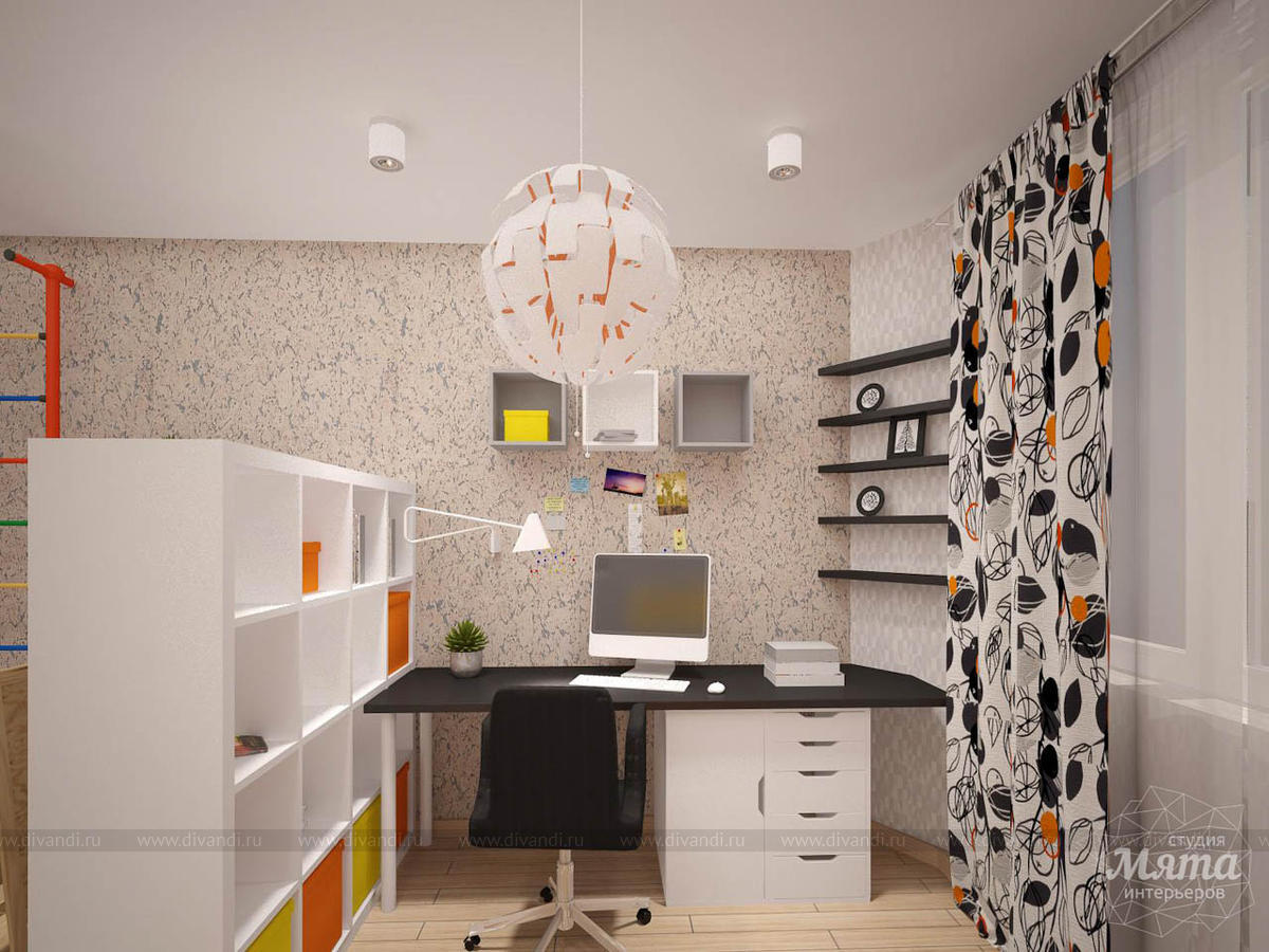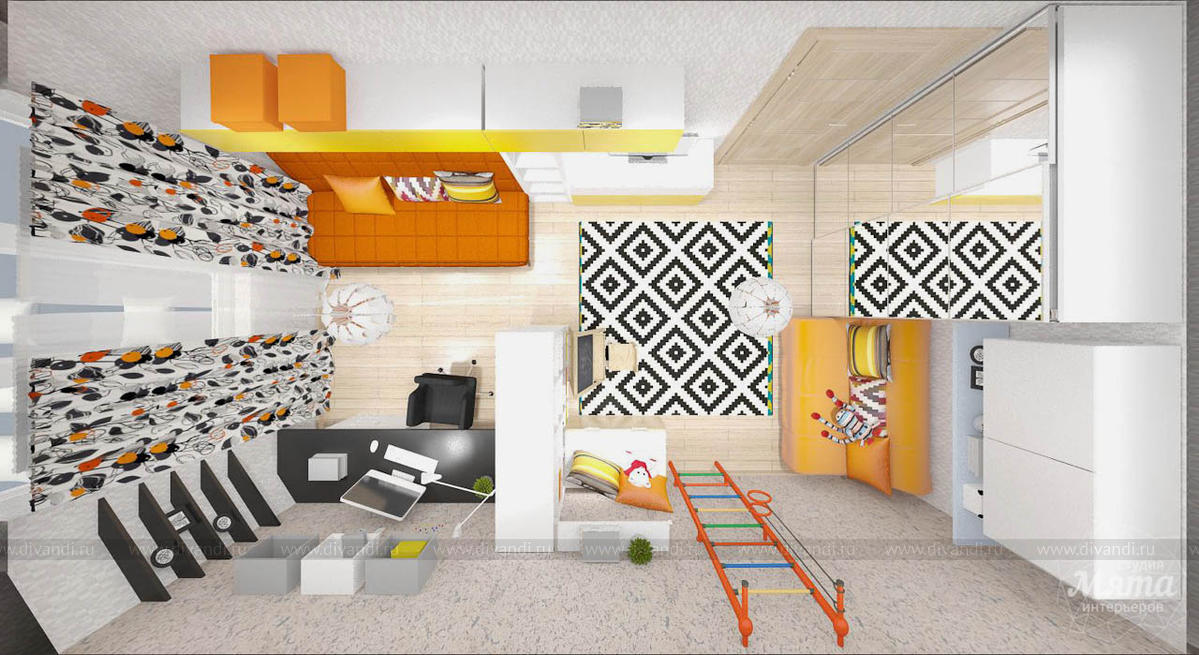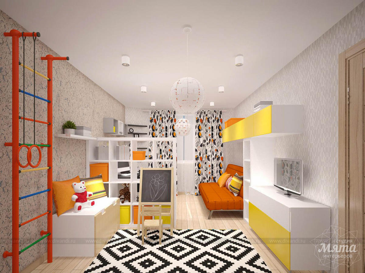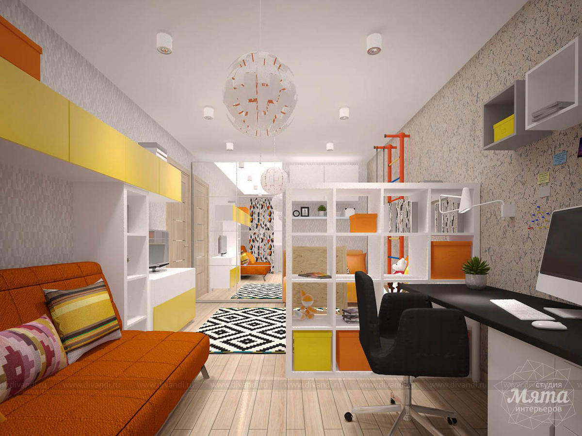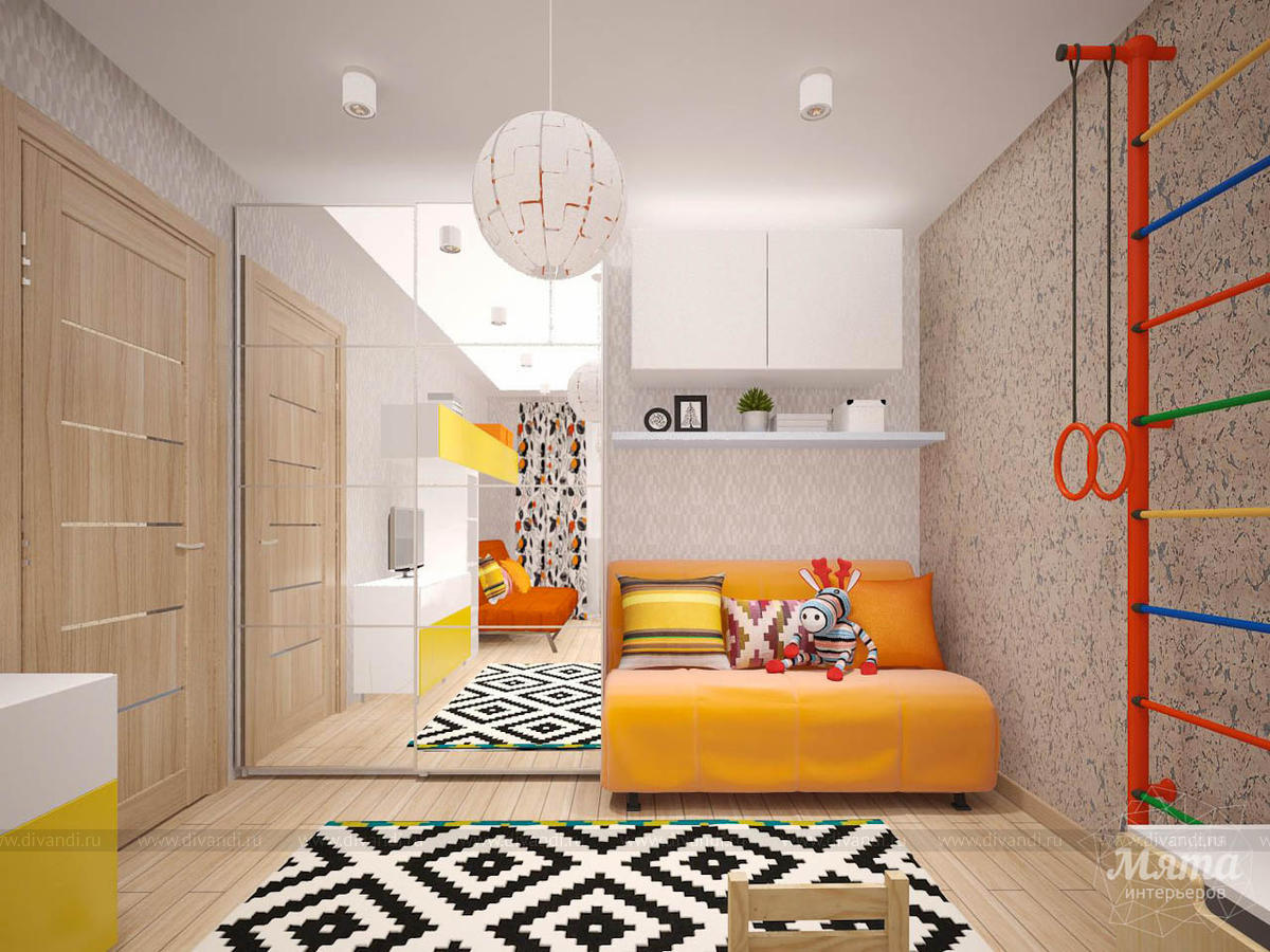 Дизайнер предложил светлый интерьер с использованием ярких акцентов, преобладающих в детской зоне. Комнату разделил стеллаж со сквозными полками, не закрывающими обзор. Большие зеркала и несколько источников освещения делают помещение светлее.