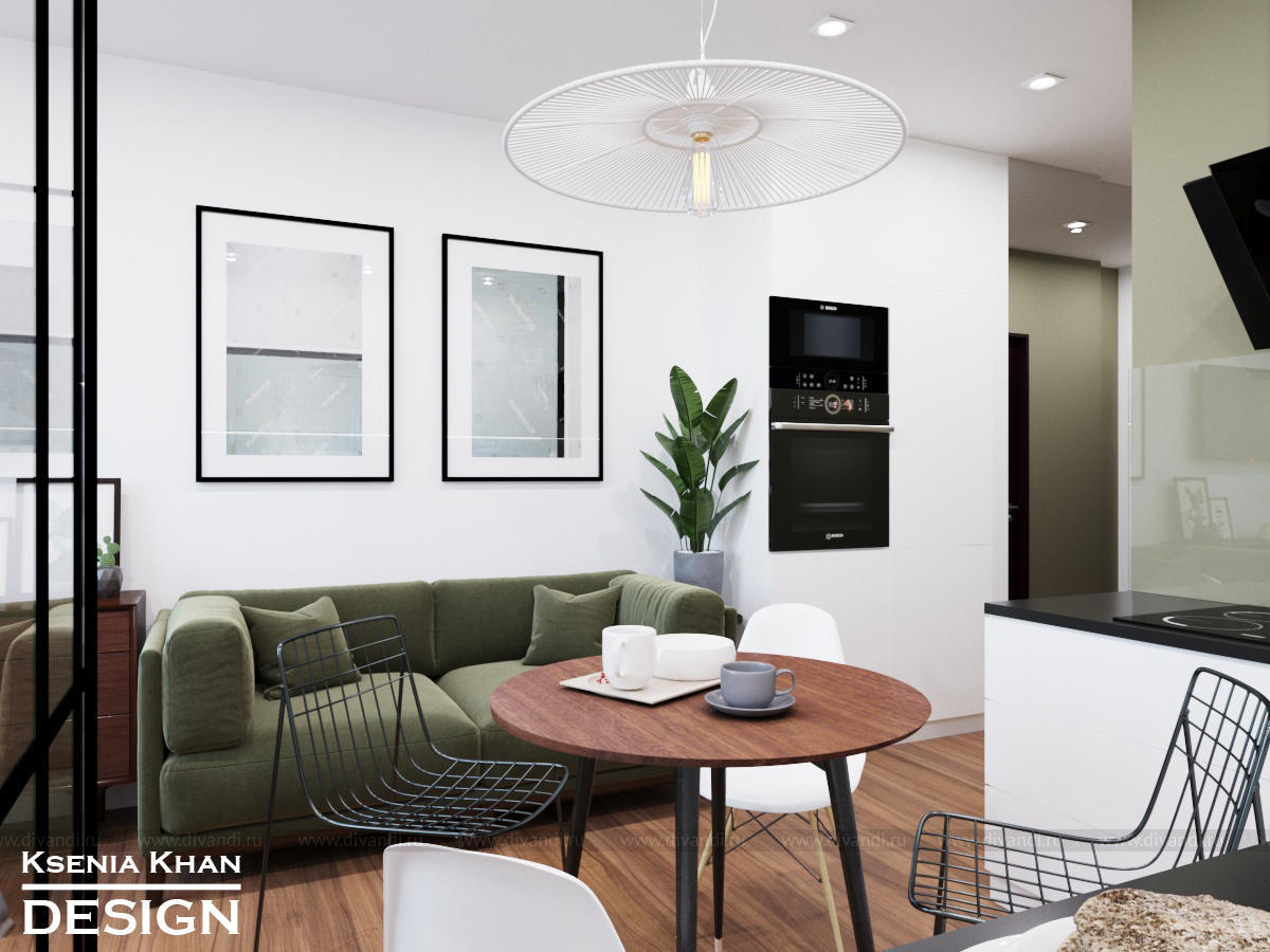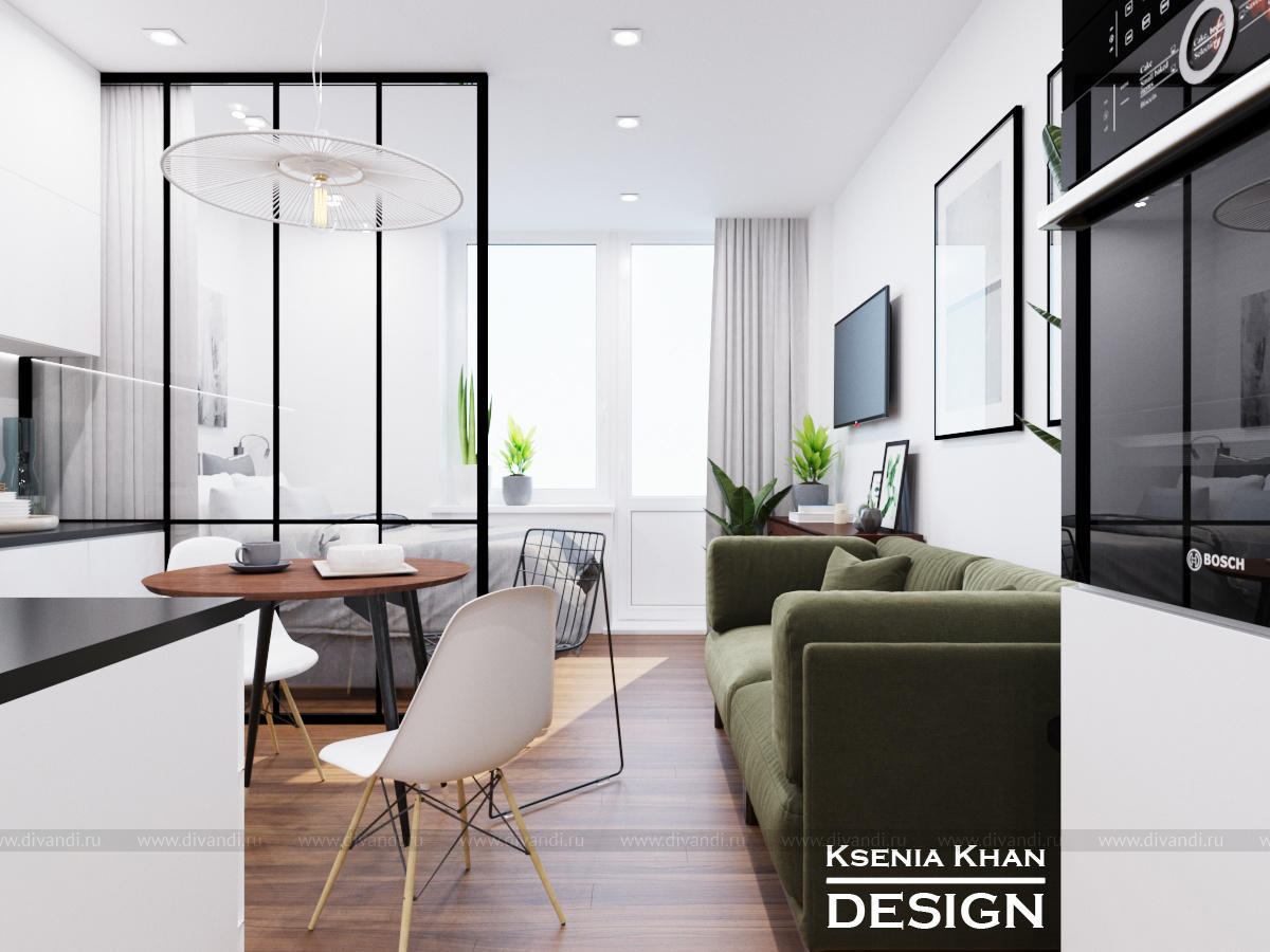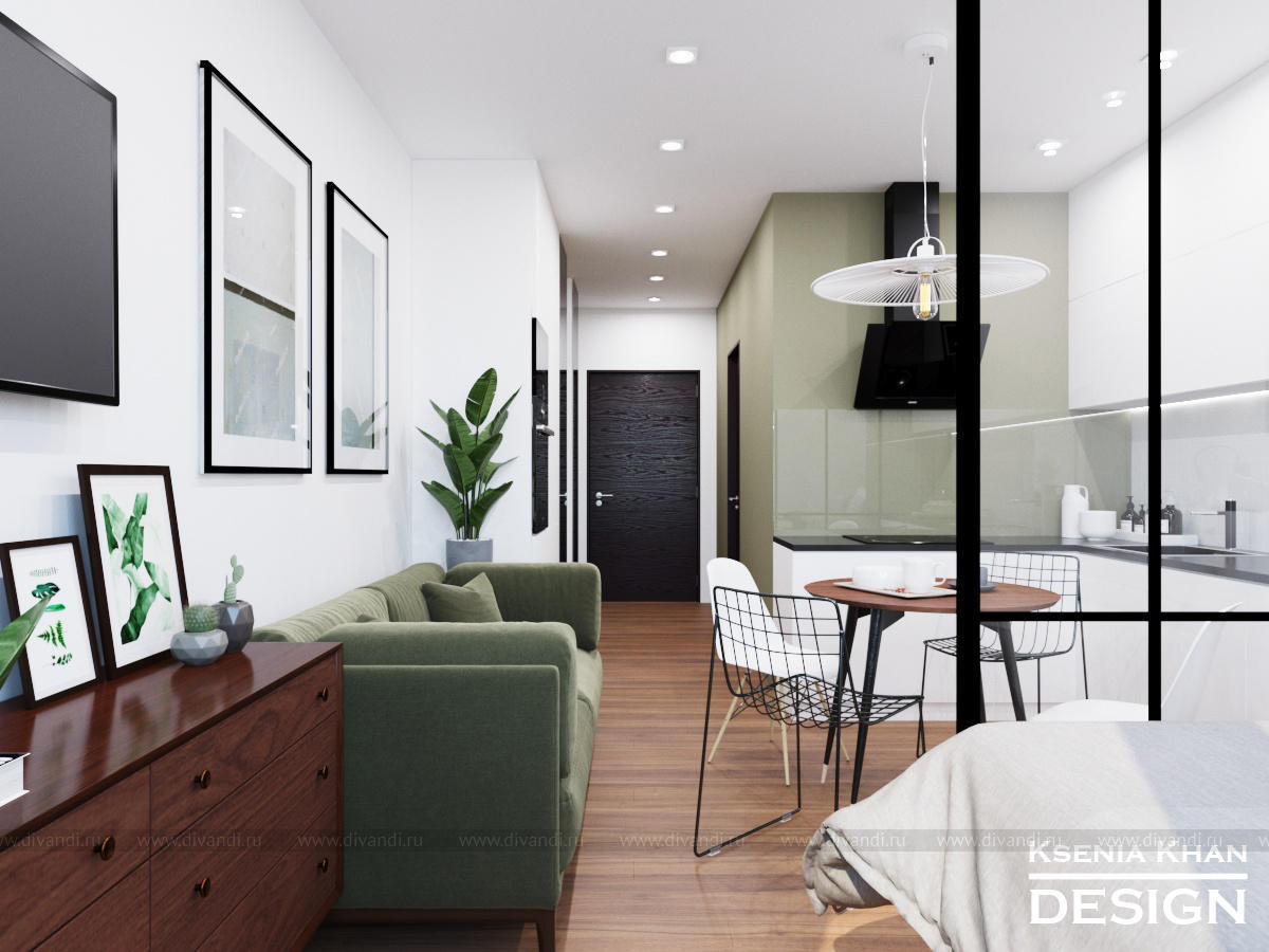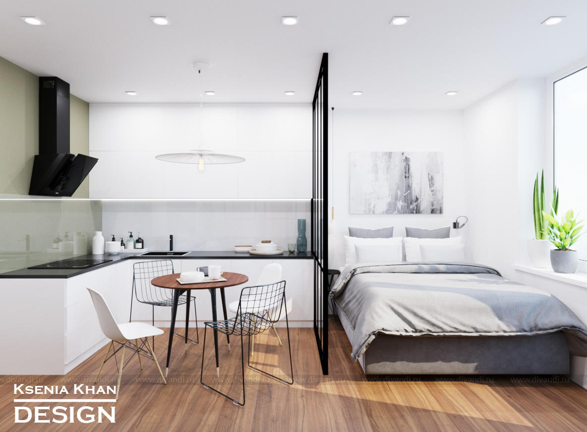 Современный интерьер квартиры студии. Очень сдержанный и максимально функциональный.