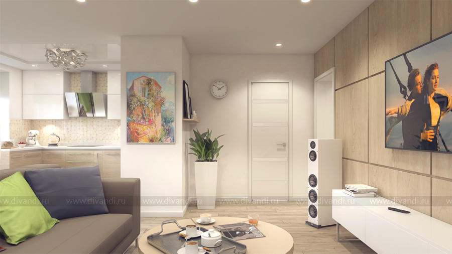 Дизайн просторной трехкомнатной квартиры для молодой семьи выполнен в современном стиле. Благодаря светлым тонам и ненавязчивым цветовым акцентам, комнаты получились легкие и наполненные воздухом. Простые интерьерные решения делают проект легкореализуемым.