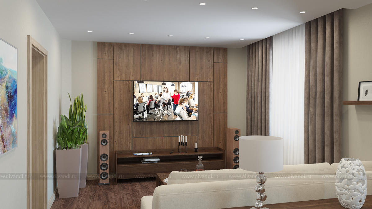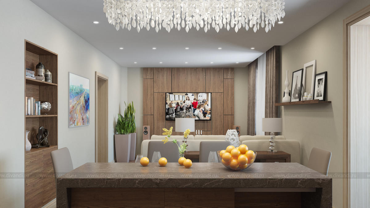 Дизайн интерьера трехкомнатной квартиры выполнен в стиле модерн. Гостиная объединена с кухней и столовой. Гладкие мебельные фасады и стеновые шпонированные панели цвета ореха придают интерьеру гостиной лаконичность и одновременно делают его уютным и респектабельным. Хрустальная люстра акцентирует внимание на столовой зоне. Цвет вносят яркие пейзажи. Интерьер спальни более сдержанный и мягкий. Современные светильники Favourite Eimer и черно-белые фотографии на стенах добавляют графичности.