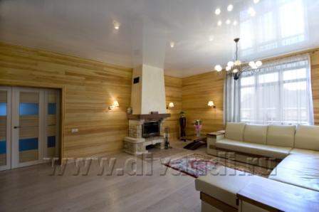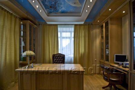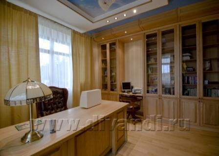 В кабинете, расположенном на первом этаже господствует классика. В оформлении интерьера присутствуют такие элементы, как панели из натурального дуба, которыми частично облицован потолок. Мебель выполнена по индивидуальному заказу, также, из натурального дуба.