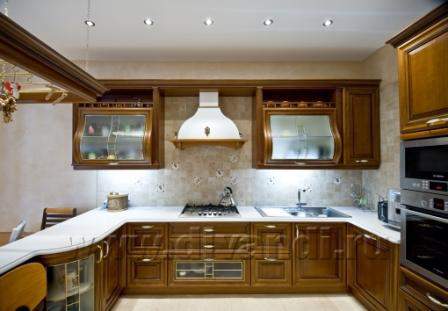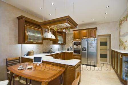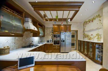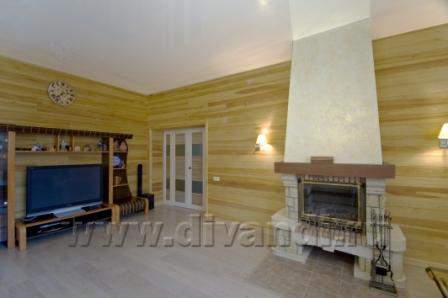Тепло деревянных поверхностей продолжает идею единства с окружающей природой и в гостиной, где доской из липы облицованы стены. В кухне, где господствует классический стиль, строгую мебель из массива со стеклянными парусными фасадами, оттеняют нежные цвета настенной росписи в средиземноморских мотивах.
