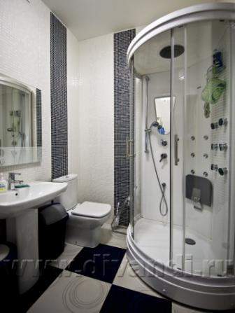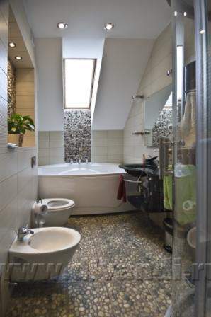 Изюминкой стала ванна с видом на небо, прямо над ней находится ничем не задекорированное окно, через которое можно любоваться на звезды. Концепцию единства с природой развивает декор стен и пола— в оформлении стеновых ниш использовалась настоящая галька, пол выложен рельефной плиткой, имитирующей такую же гальку, она смотрится очень естественно и приятна на ощупь.