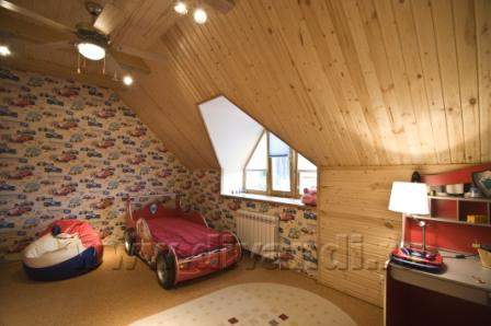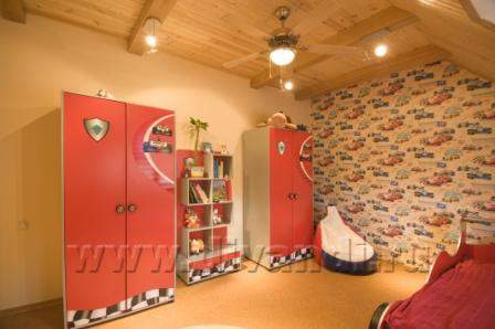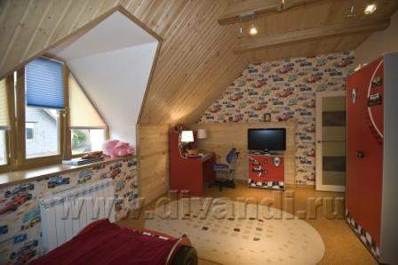 В интерьере использовались исключительно натуральные материалы. Поэтому и цвета в большинстве своем соответствующие — природные, натуральные и умиротворяющие - различные оттенки бежевого, коричневого, зеленого. Не обошлось, конечно, и без ярких цветовых акцентов - например, ярким и графичным поучился гостевой санузел: контрастная цветовая гамма белый/темно-синий, зрительно увеличила объем этого маленького помещения. Насыщенными цветовыми акцентами в детской комнате для старшего сына стали яркие бумажные обои и красная мебель, при этом стены обшиты вагонкой из светлого дерева, смягчающей активный красный цвет.