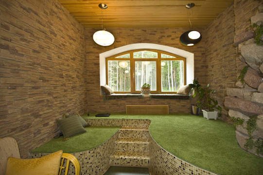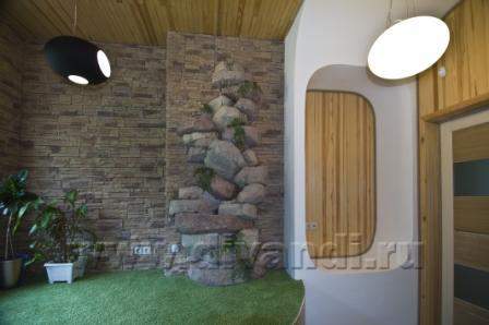 Комната для релаксации появилась именно в этом помещении не случайно, ведь из окна здесь открывается великолепный вид на лес. Пейзаж настолько завораживающий, что на него можно любоваться часами. Поэтому, подоконник в комнате, превратился в место для сидения или лежания. Природную тему было решено продолжить и в интерьере — мягкое ковровое покрытие с высоким ворсом сочного зеленого цвета напоминает траву, стены декорированы искусственным камнем, потолок отделан натуральной деревянная доской, есть здесь и декоративный фонтан — вид бегущей воды, ее плеск — все это способствует релаксации, расслаблению.