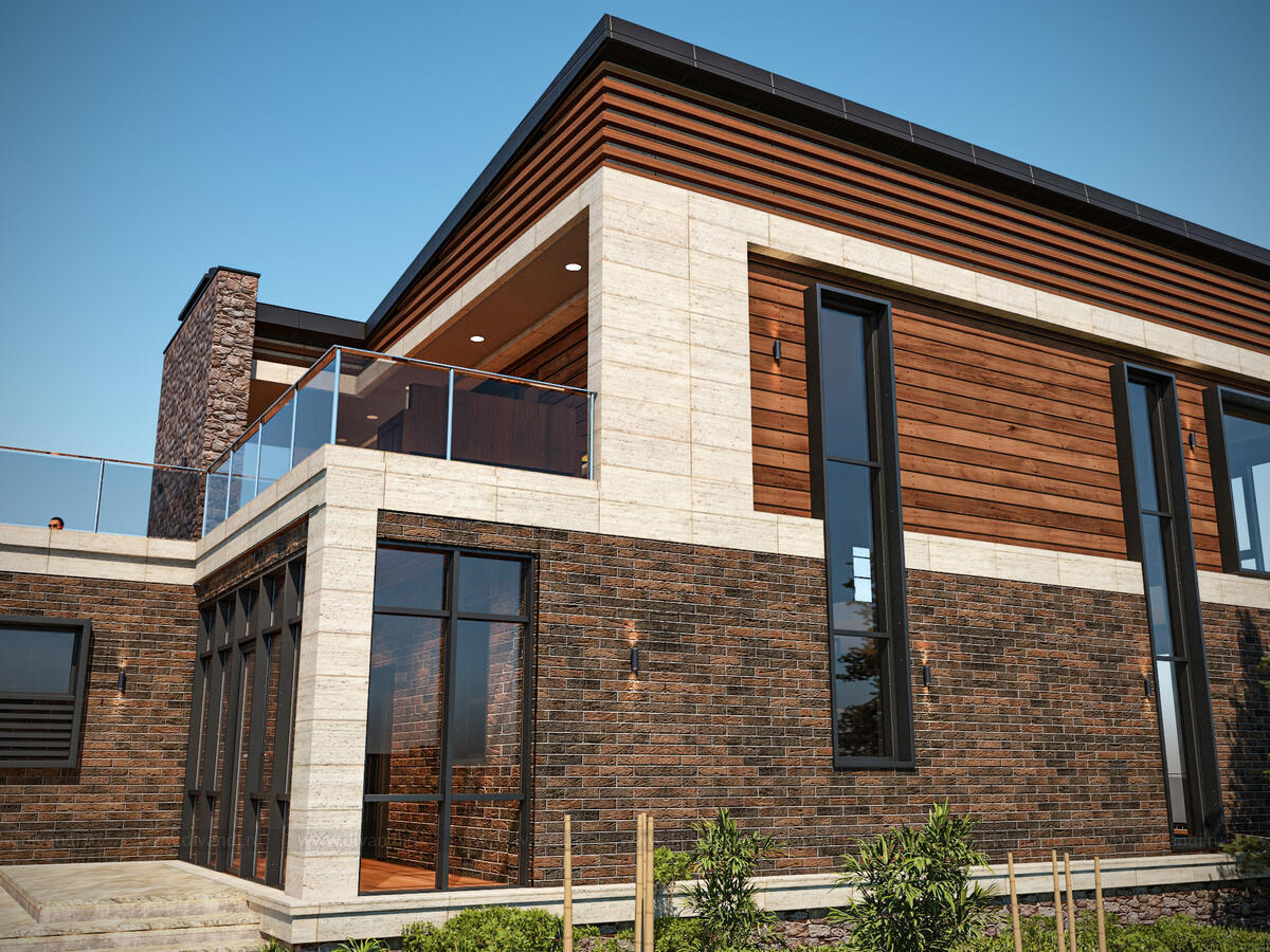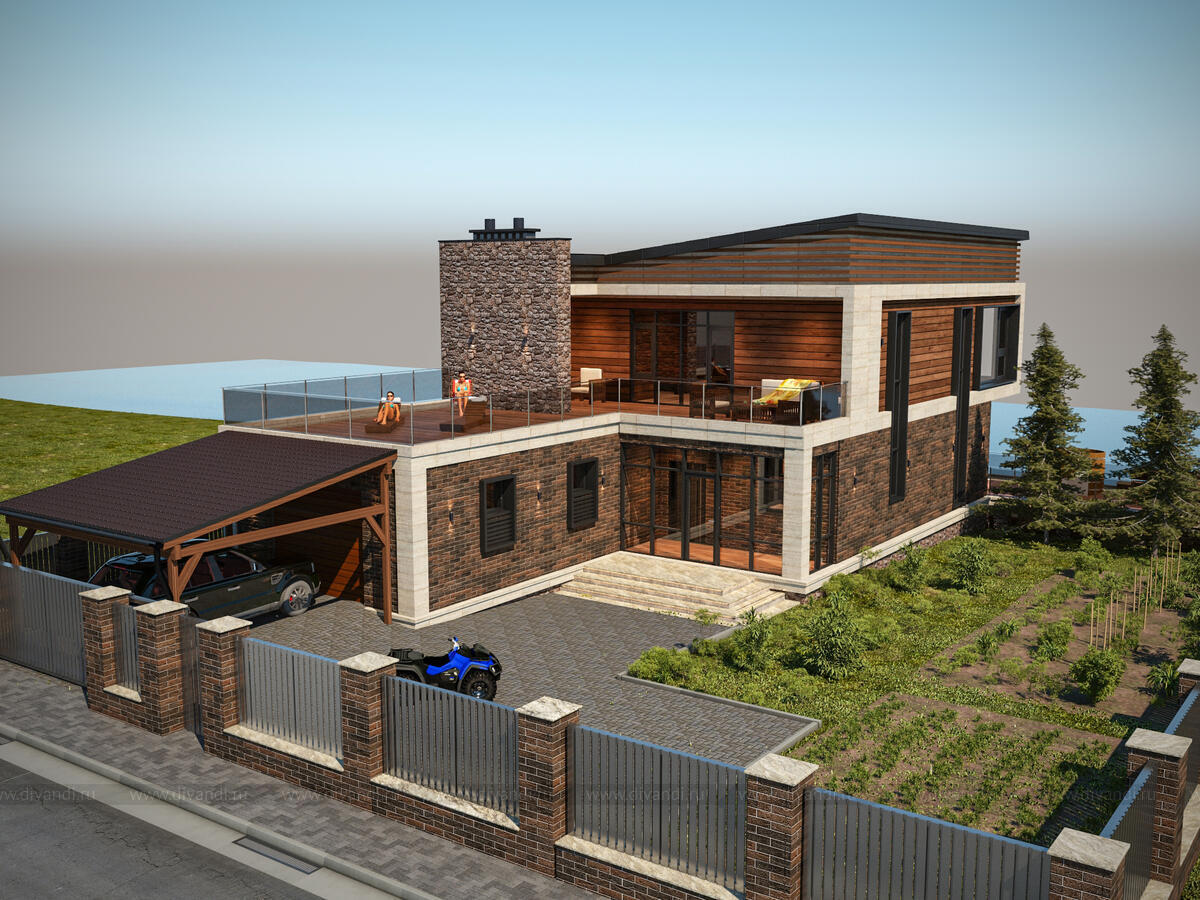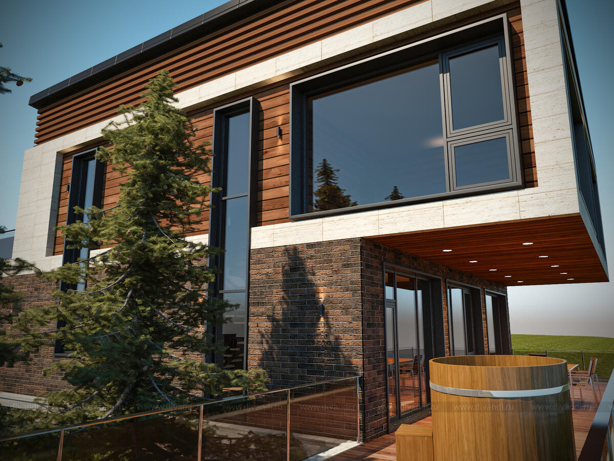 Проект современного двухэтажного коттеджа, который отлично подойдет для проживания в нем большой семьи из пяти – шести человек. Визуально постройка поделена на две части, так как в облицовке первого и второго этажей использованы различные материалы.