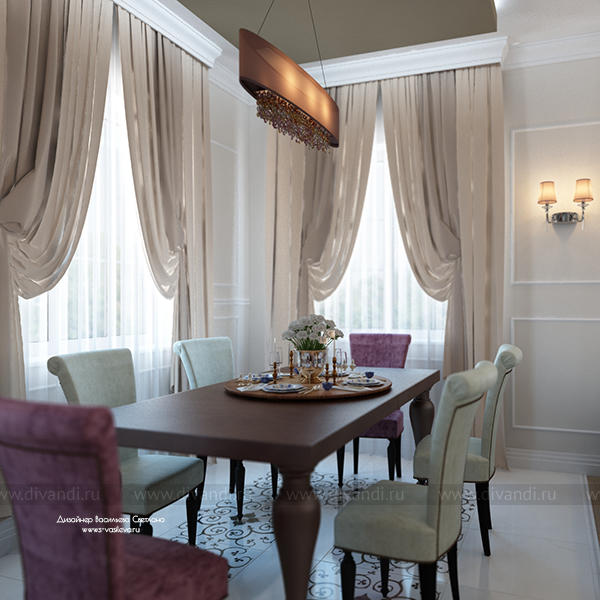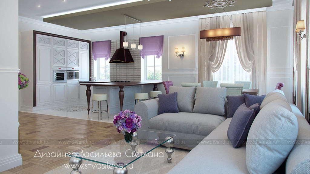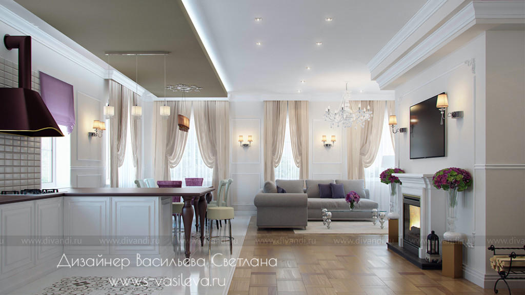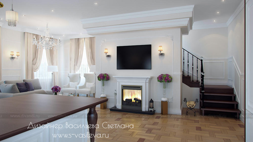 Основное помещение первого этажа- это объединенная кухня-гостиная столовая. Выполнена она так же в классическом стиле. На стенах- покраска в один тон, с декоративными молдингами на стенах.