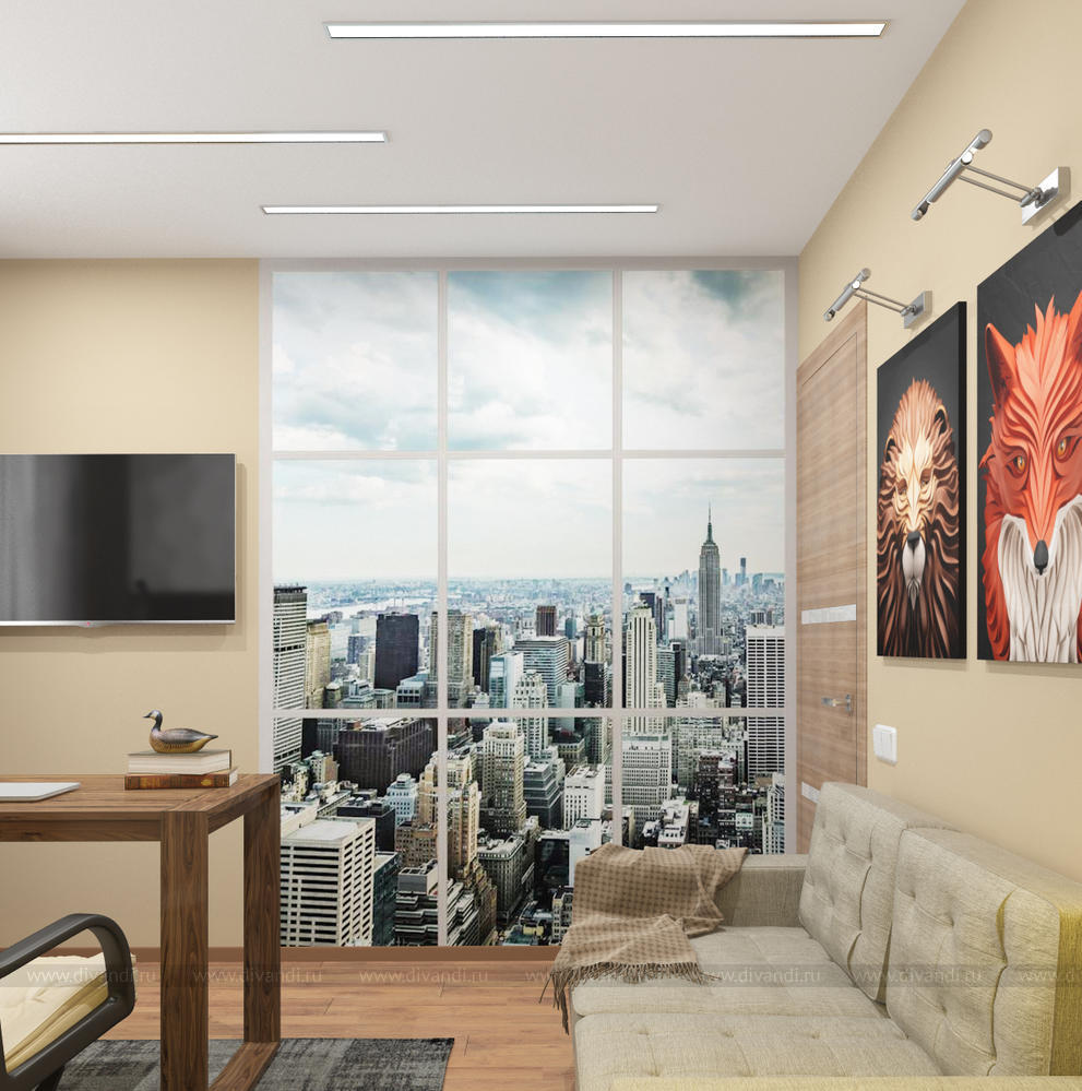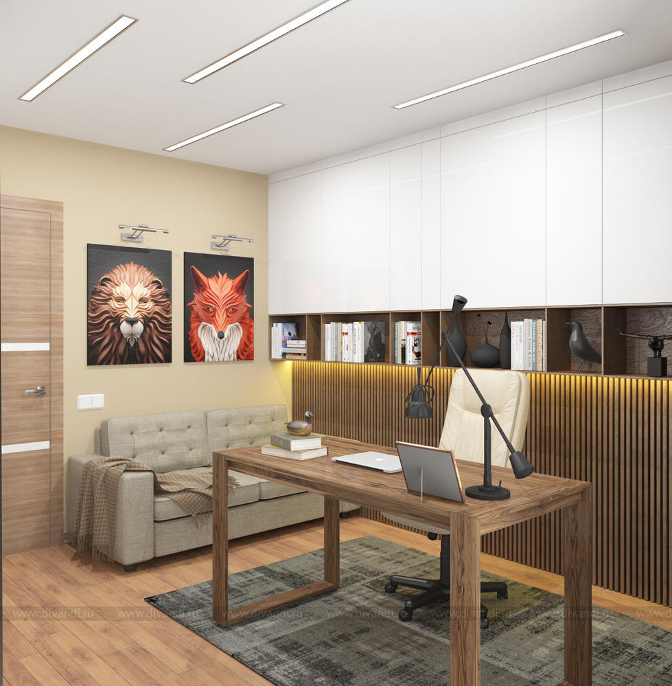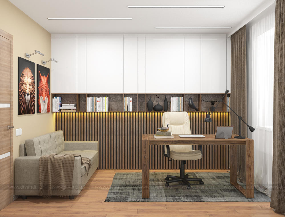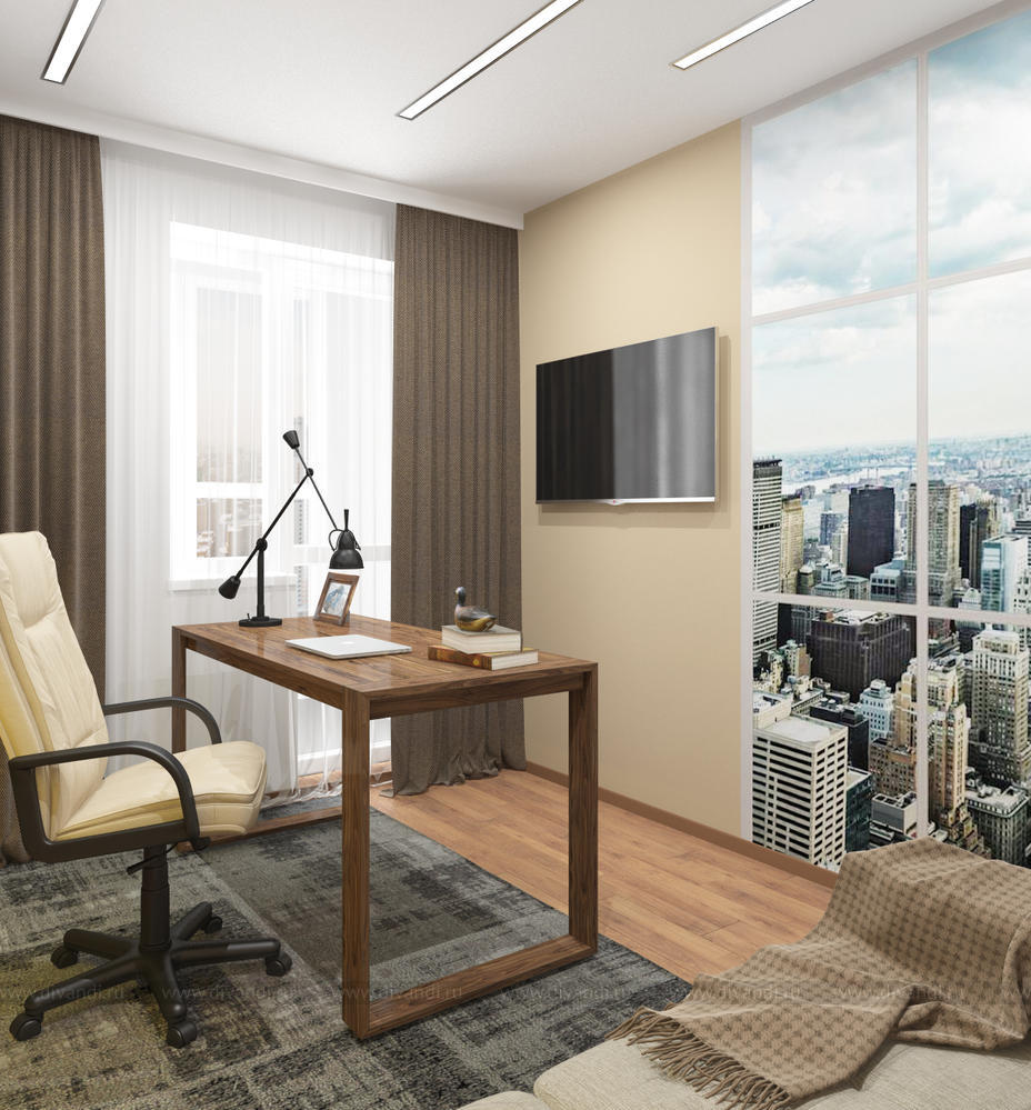 Кабинет в современном стиле выполнен для хозяина трех-комнатной квартиры в г. Екатеринбург. Задачей было спроектировать легкий и современный интерьер для работы за компьютером в домашних условиях, с возможностью размещения гостей на ночь в случае их приезда.