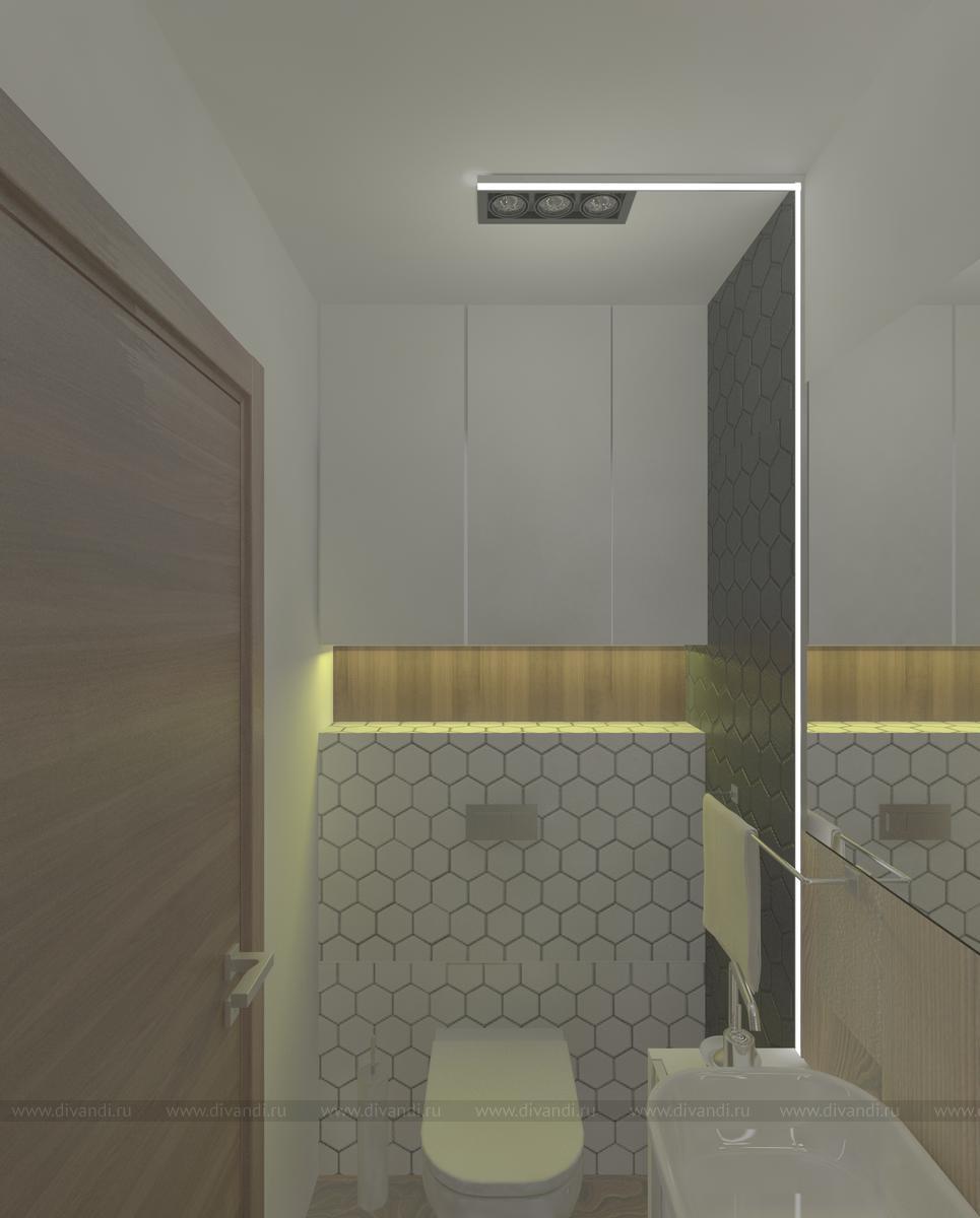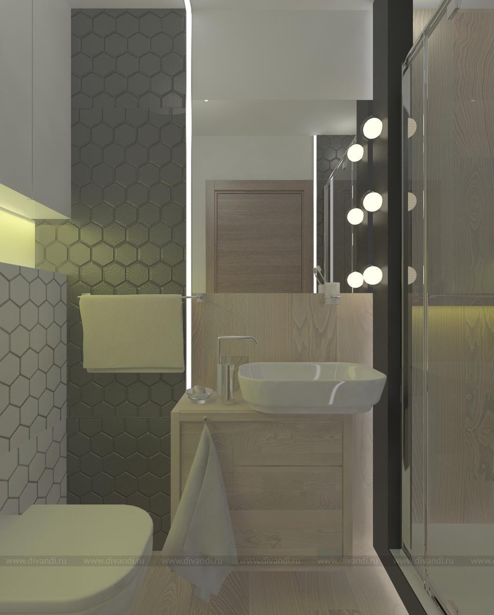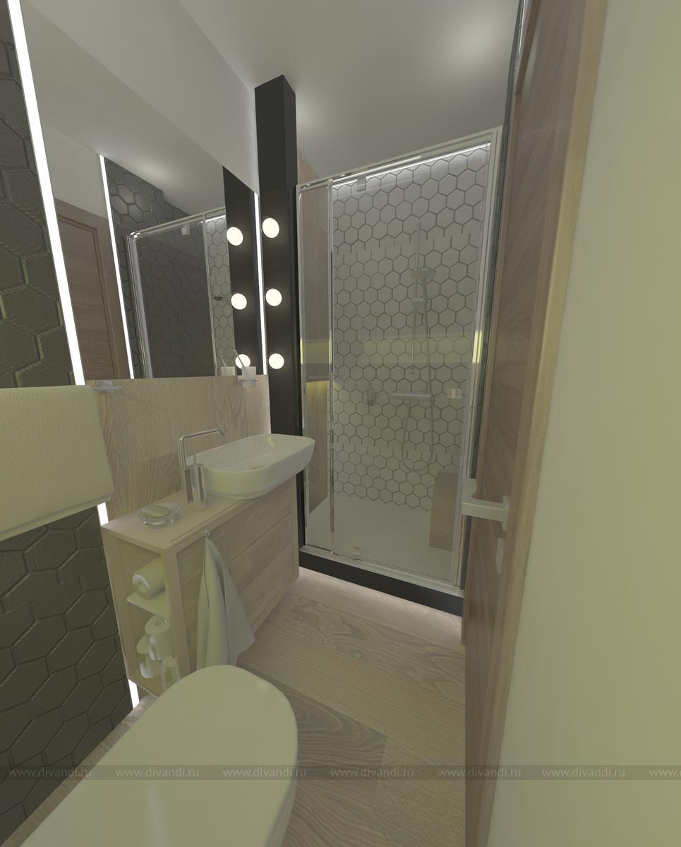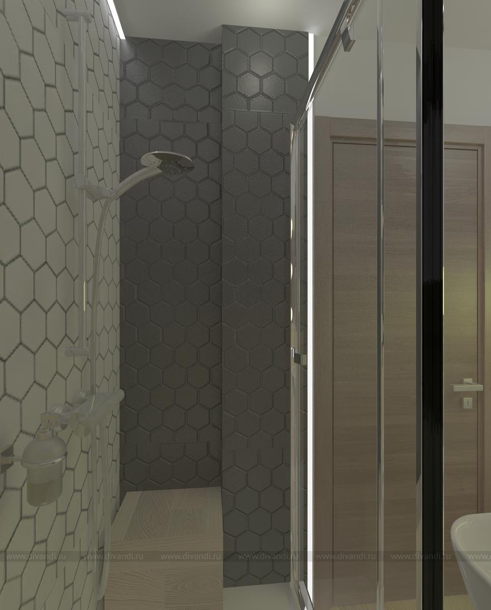 При перепланировке расширили, за счет коридора, помещение маленького санузла. Таким образом, получилось вместить небольшую душевую в стиле - минимализм с элементами лофта.