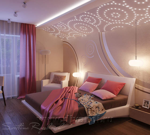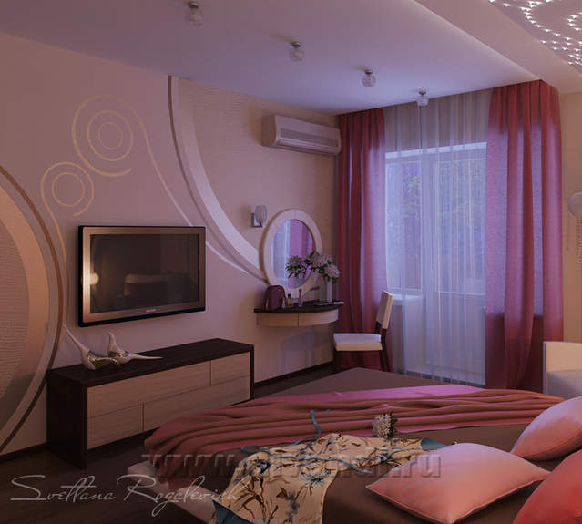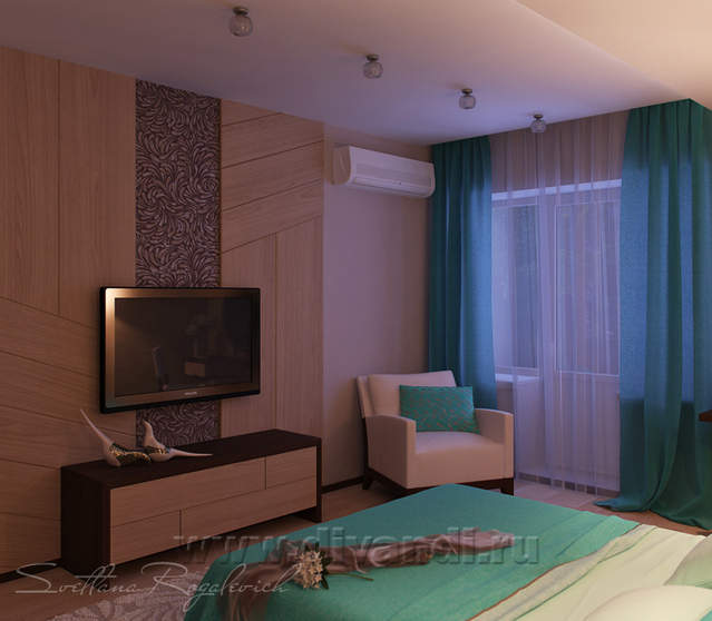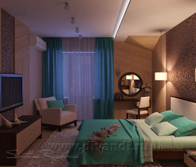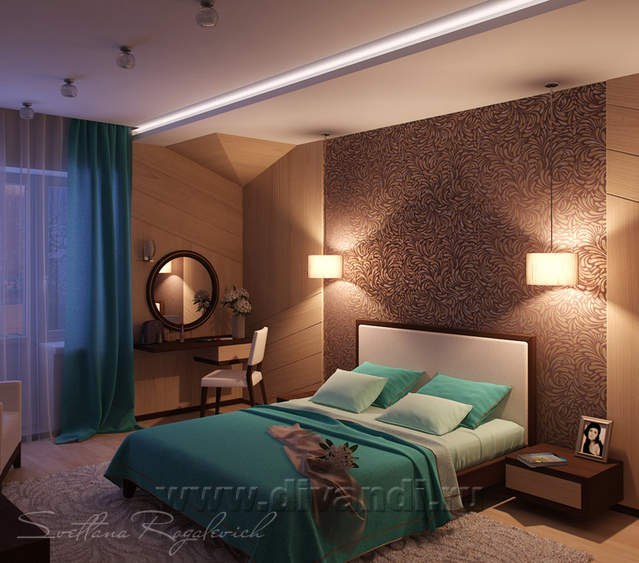 Спальня расположена на 2-ом этаже коттеджа. В первом варианте учтено изначальное пожелание заказчиков - использование дерева в отделке стен. Меня всегда вдохновляет дерево в качестве отделочного материала, поэтому с интересом разрабатываю авторские элементы из него - панели на стенах, их форма - тому пример. Вариант понравился, но не был утвержден, поскольку позднее захотелось моим клиентам плавных округлых линий в декоре стен и оригинальной дополнительной подсветки. Так появился новый, принципиально другой вариант, который и был утвержден.