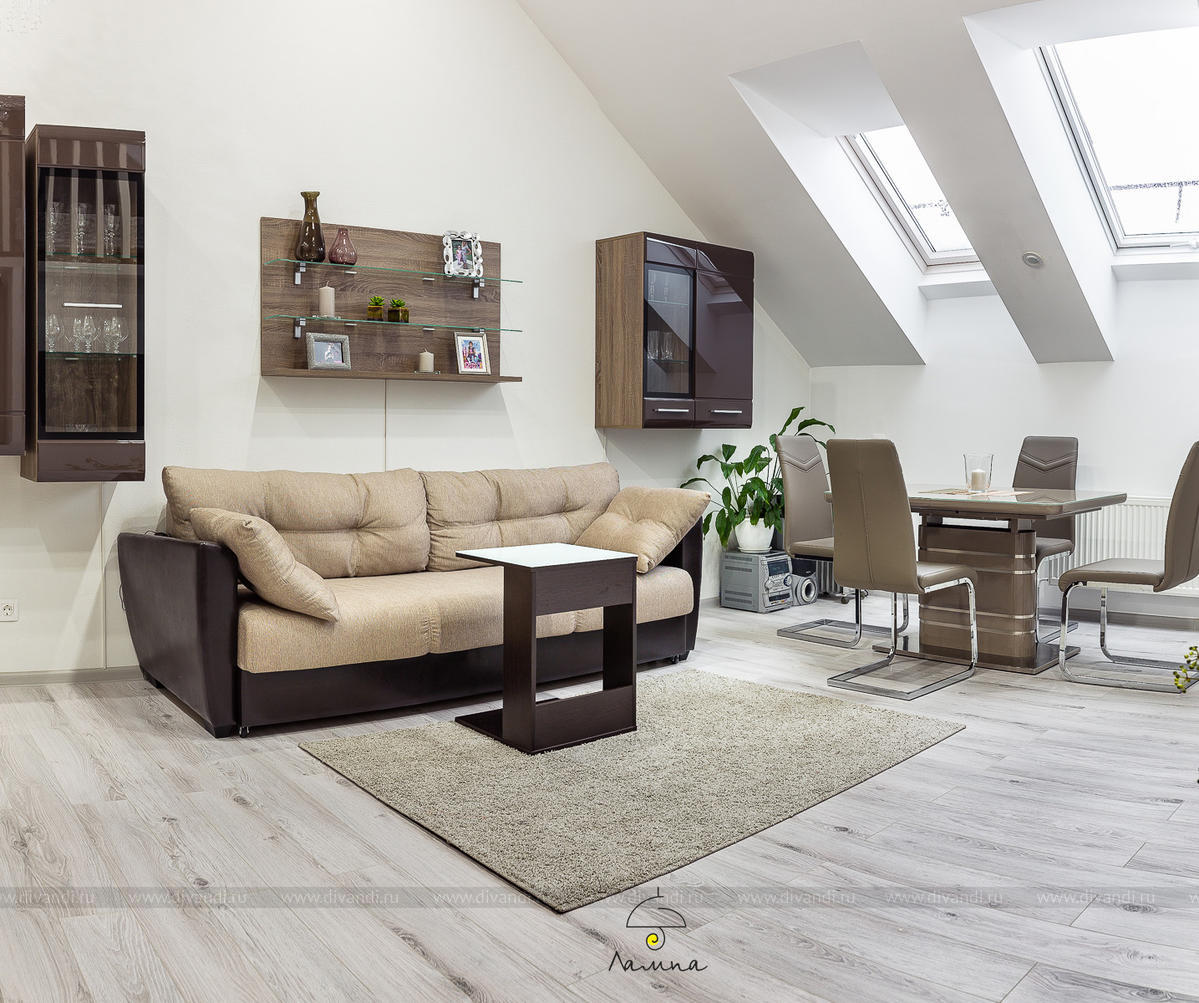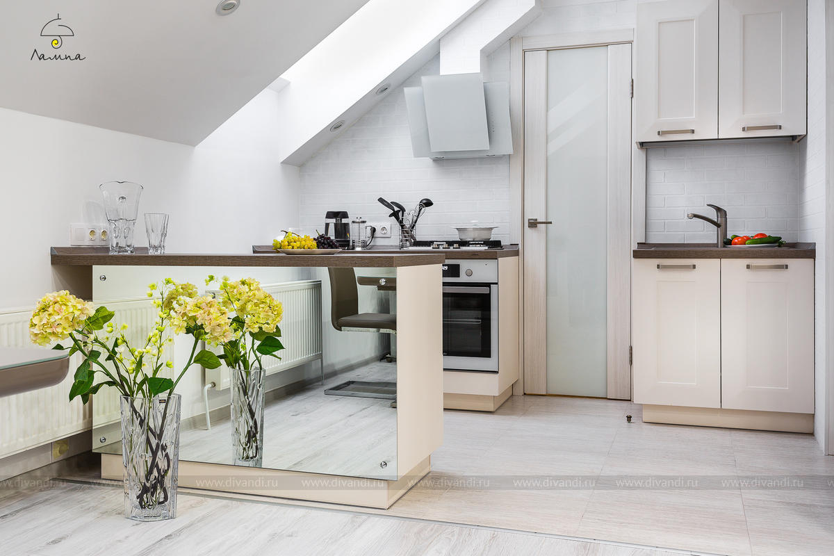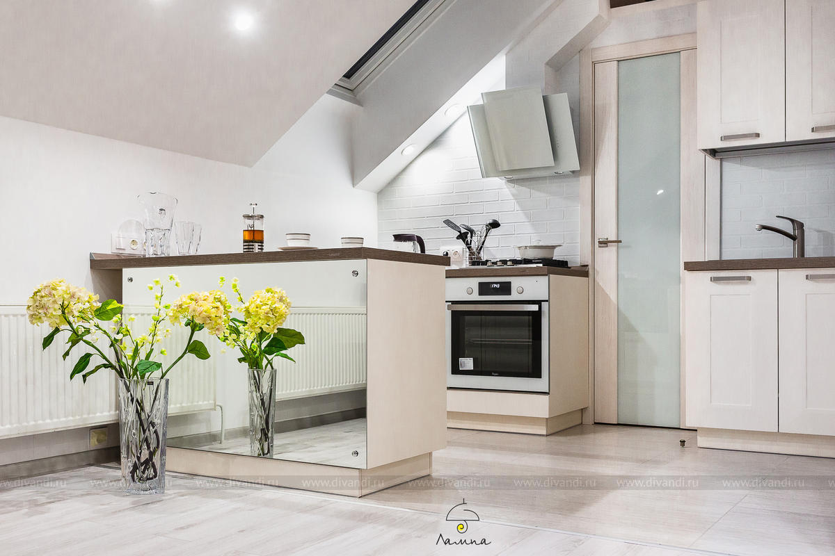 В этом проекте, благодаря тому, что квартира находится в мансардном этаже и высота потолков 4.8 м, мы увеличили жилую площадь квартиры за счет устройства антресоли. Там разместилось уютное спальное место.