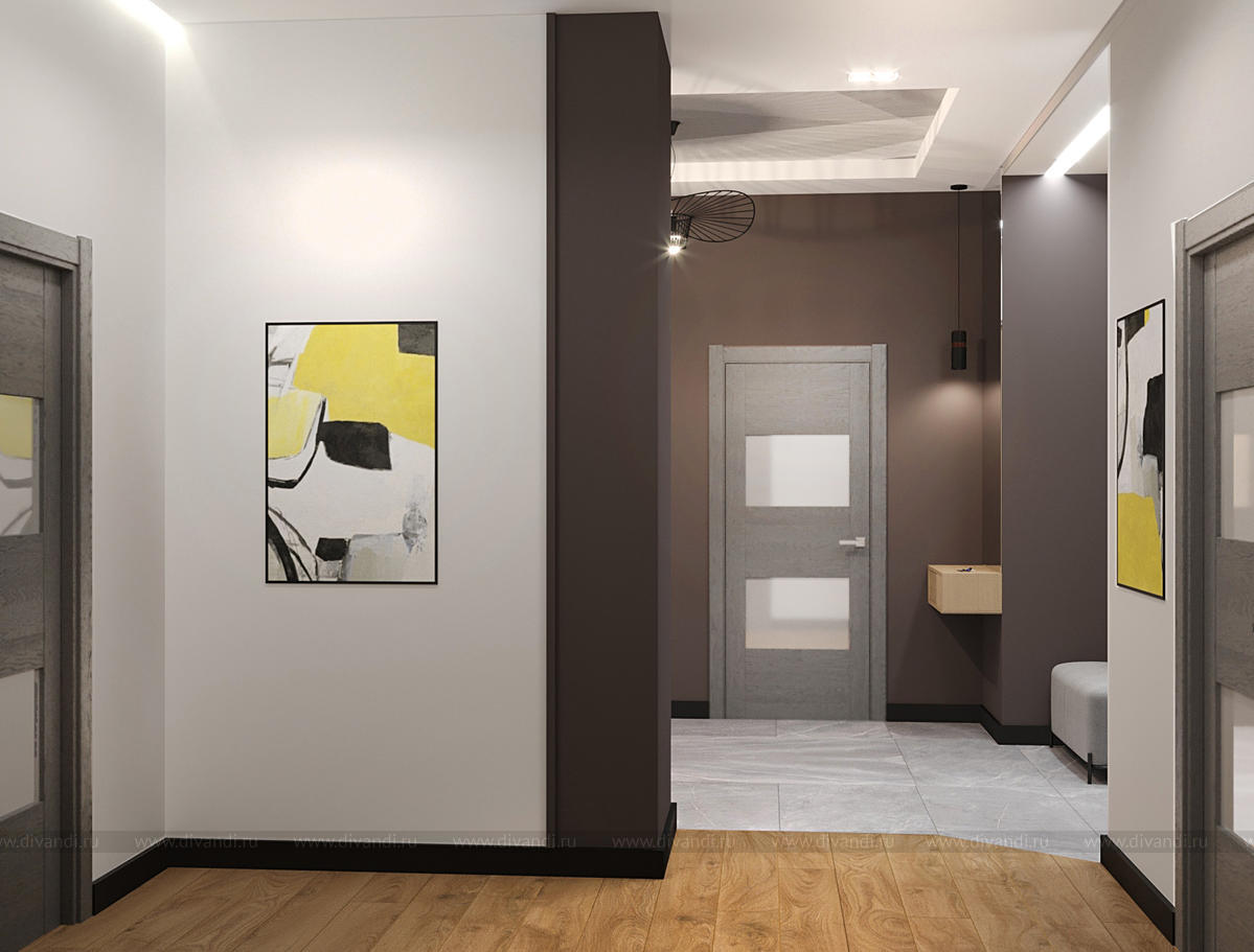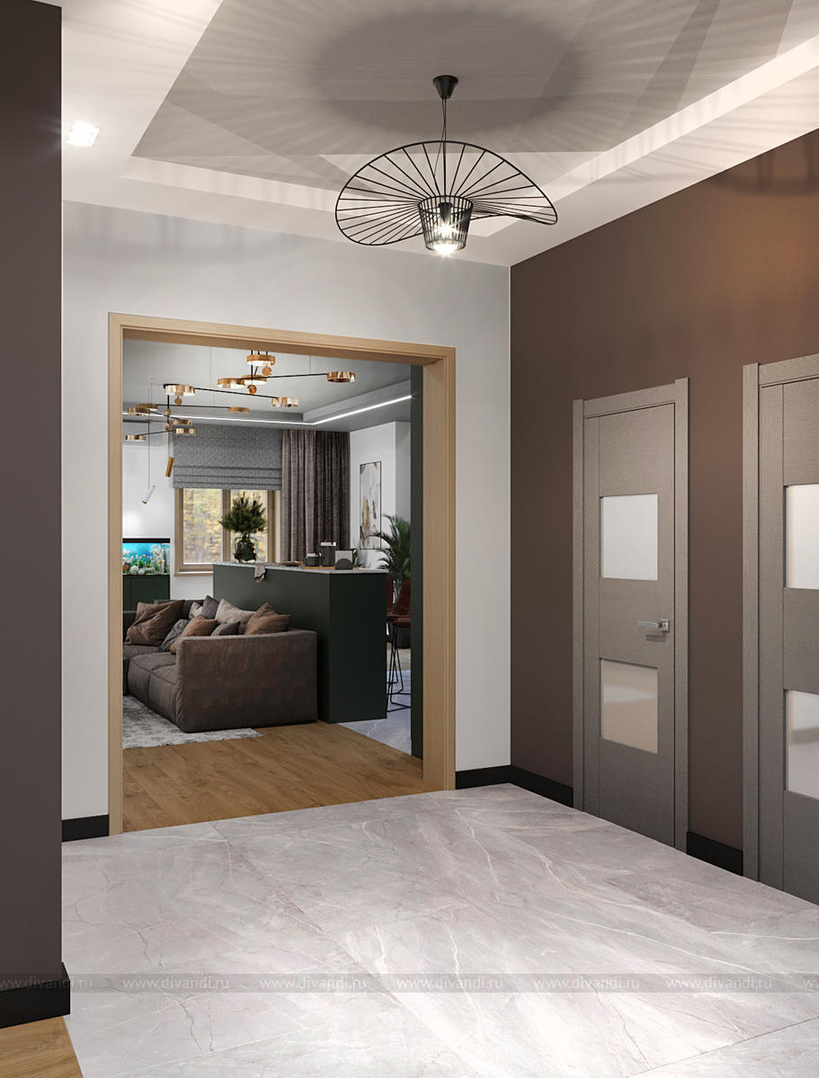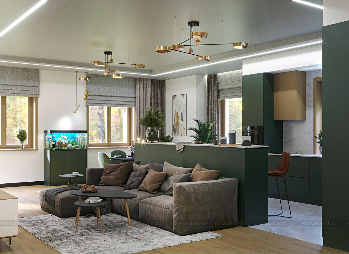В домах всегда хочется подчеркнуть их близость к природе. Окна из дерева, паркет, много растений. Цвет кухни и барной стойки - насыщенного оливкового цвета. Мягкая и корпусная мебель тёплых, натуральных оттенков от охры, до темно-серого. Вариативность освещения позволяет использовать как яркий свет( во время приема гостей), так и акцентный, приглушенный в виде торшера, бра и подвесных светильников. Бюджет заказчик ограничил материалами среднего ценового диапазона. В проекте использованы декоративные панели OracDecor, свет -Lampatron, штукатурка под бетон и плитка в зоне кухни КерамаМарацци.