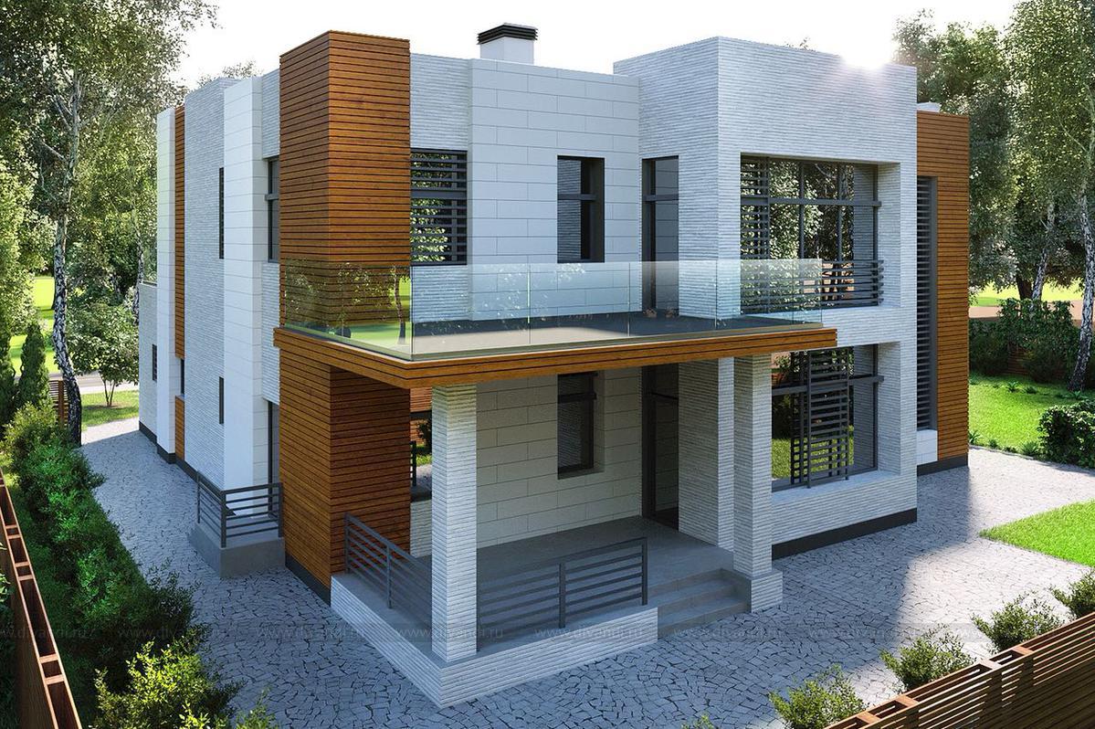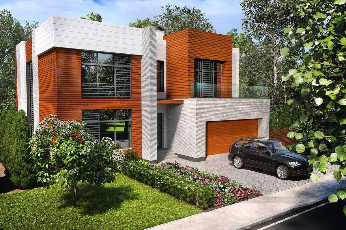 Фасад решен в стиле хай-тек с использованием трех разных материалов. Термодоска, клинкерный кирпич и керамогранит.