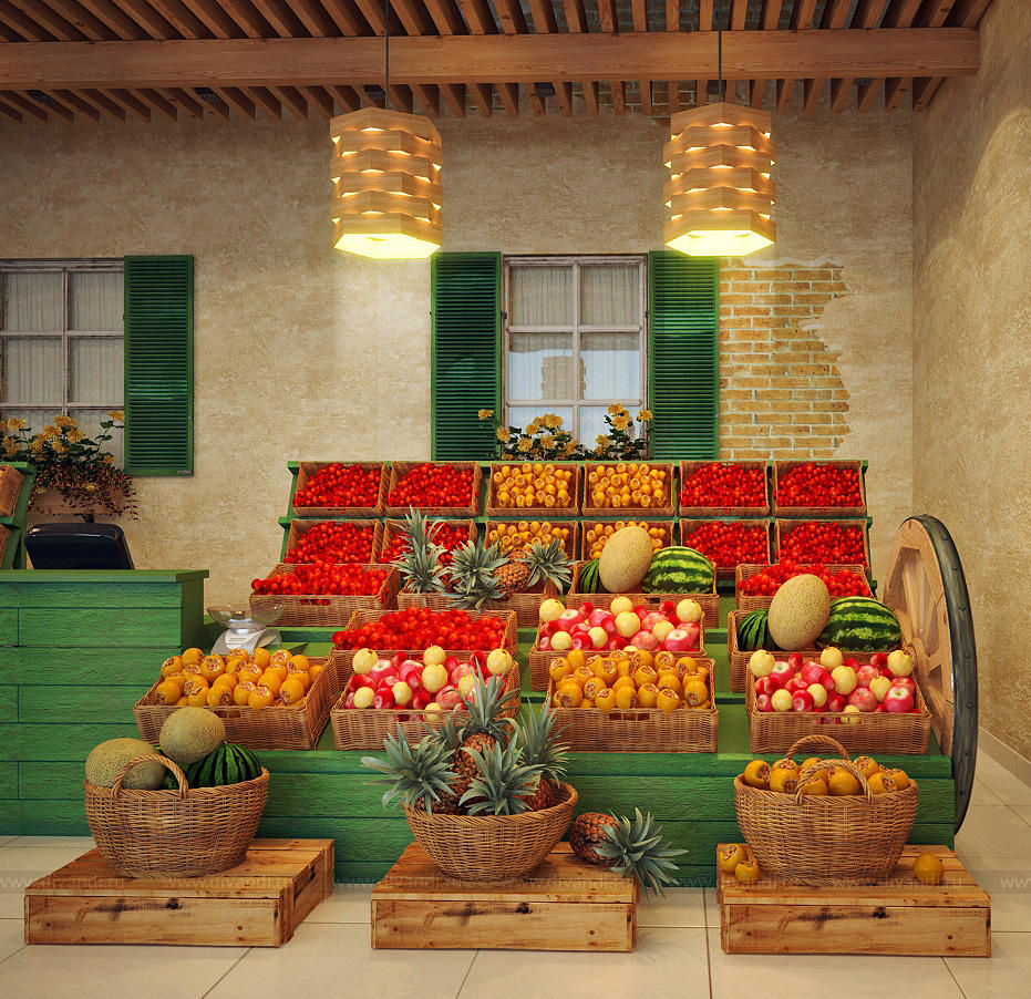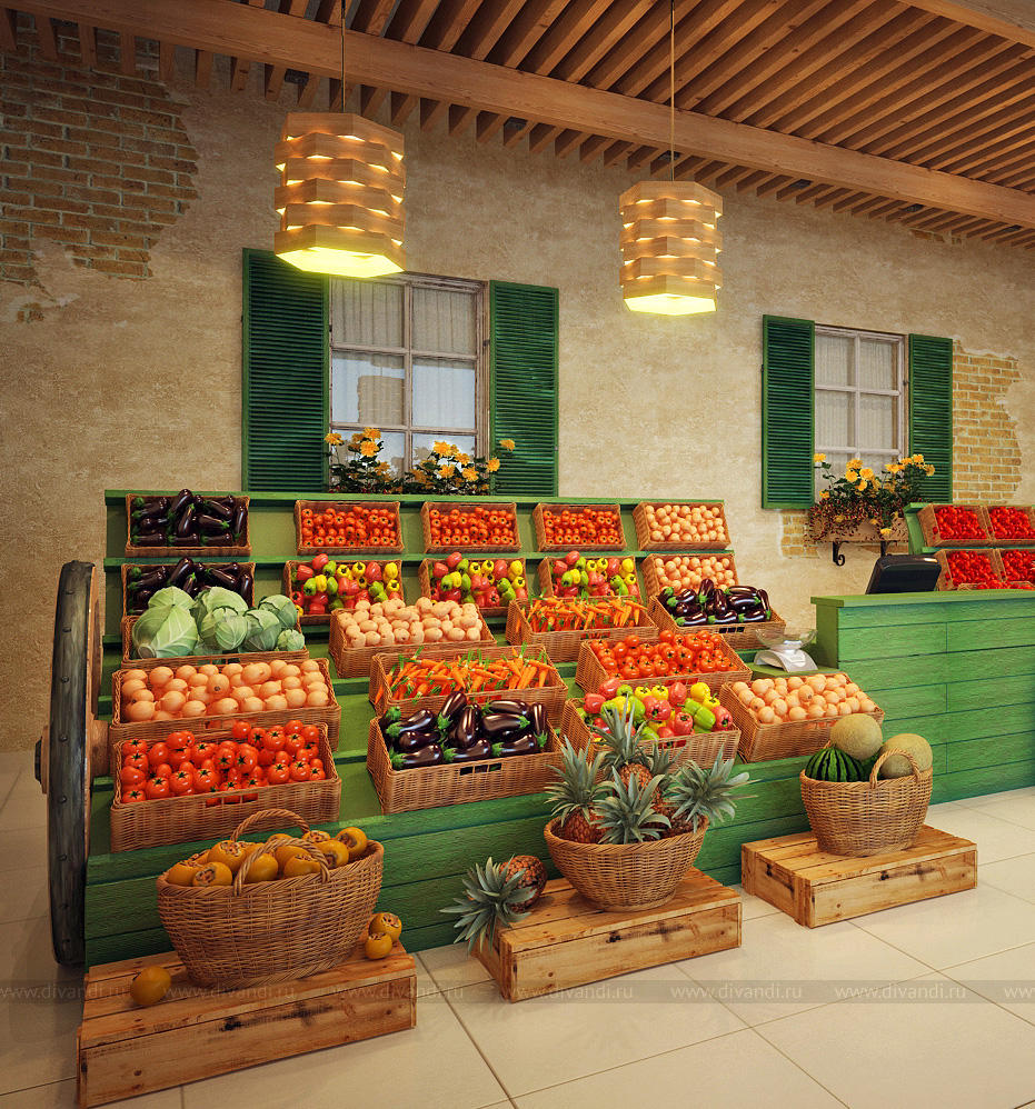 Работая над созданием данного проекта, наши дизайнеры вдохновлялись аутентичными средиземноморскими уличными рынками, куда каждое утро трудолюбивые фермеры вывозят свой урожай. Дизайн интерьера овощного отдела наполнен такими деталями, как плетеные корзинки со свежими продуктами, деревянные прилавки, каменные фрагменты стен. Все продукты располагаются таким образом, что их можно потрогать и понюхать, а понравившееся - самостоятельно выбрать. Такая упрощенность доступа к товару очень импонирует хозяйкам, привыкшим делать покупки на рынках, а также работникам маркета при выкладке продуктов на стеллажи.