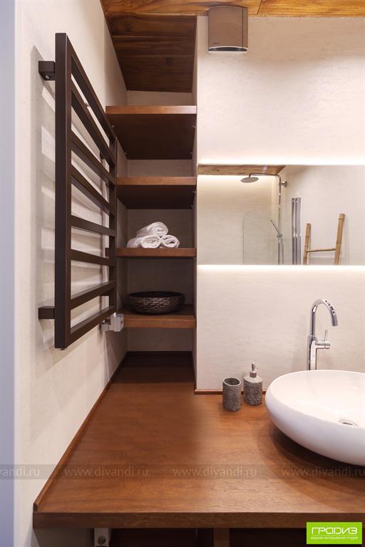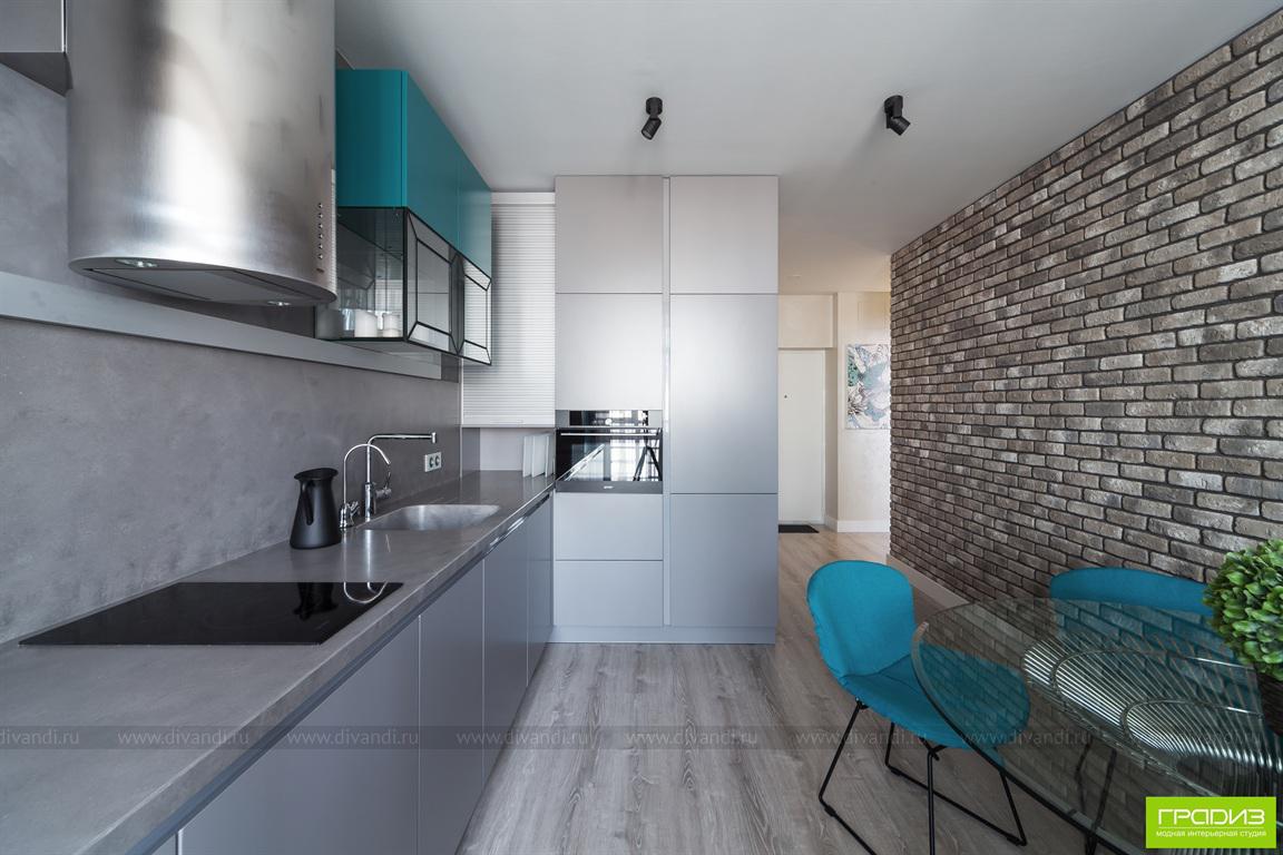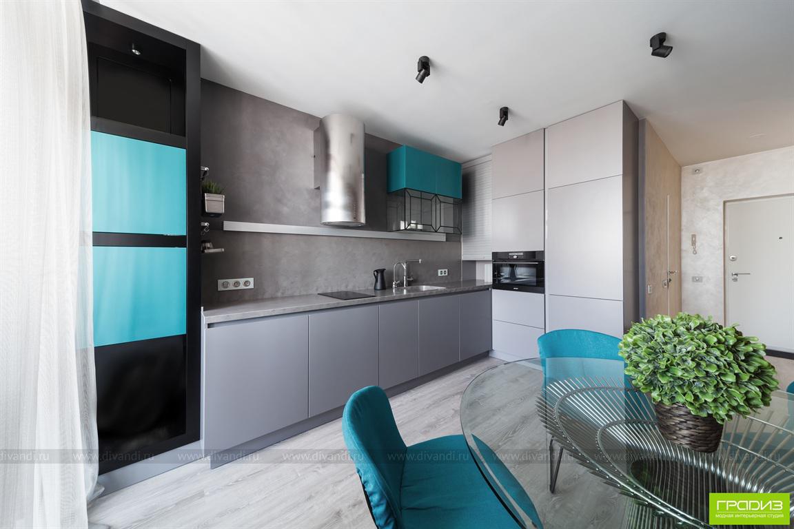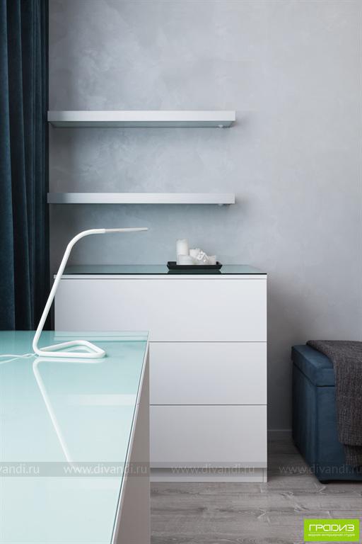В этой квартире для юной девушки-студентки одна комната отдана под спальню, а другая целиком под гардеробную. В интерьере много дизайнерских фишек: минималистичная кухня "под бетон" с ажурным шкафом из стекла и металла (веяние последних европейских выставок), "теплая" ванная с тиком и декоративной штукатуркой "под травертин", стильный санузел с сияющей плиткой с эффектом чешуи и многое другое!