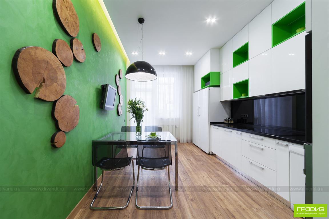 У заказчиков было много идей будущего интерьера, все из которых мы постарались гармонично разместить под одной крышей. "Яблочную" кухню, о которой мечтала заказчица, санузел с джунглями, ванную в морском стиле с 3D-полом, спальню с бубном, напоминающем заказчикам о жизни на севере.