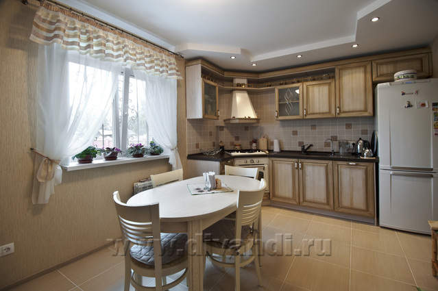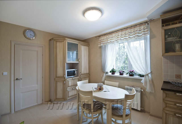 Кухня выполнена в уютном домашнем стиле прованс. Вся мебель сделана из натурального патинированного дуба, остальные элементы интерьера так же подобраны в светлой цветовой гамме.
