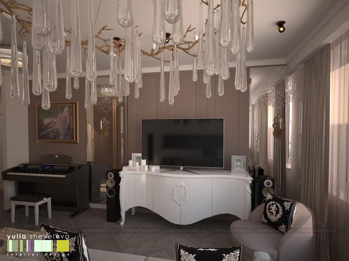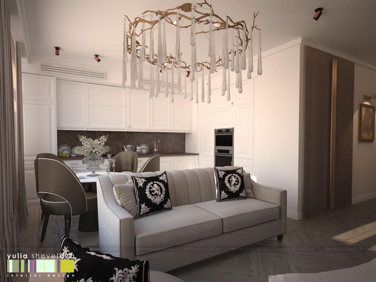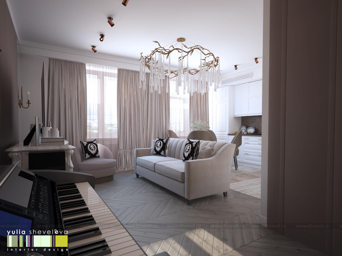 Гостиная - это салон для приема гостей. Здесь можно уютно устроится на диване, послушать, как играет хозяйка на фортепьяно. Нарядная кухня устроена в ниши, таким образом очень органично вливается в окружающее пространство. На полу - деревянный паркет, укладка французской елочкой. Стены украшены тканевыми панелями из нежной алькантары, за одной из них скрывается вход в хоз.блок. Центральное место в гостиной занимает люстра португальской фабрики Serip ручной работы.