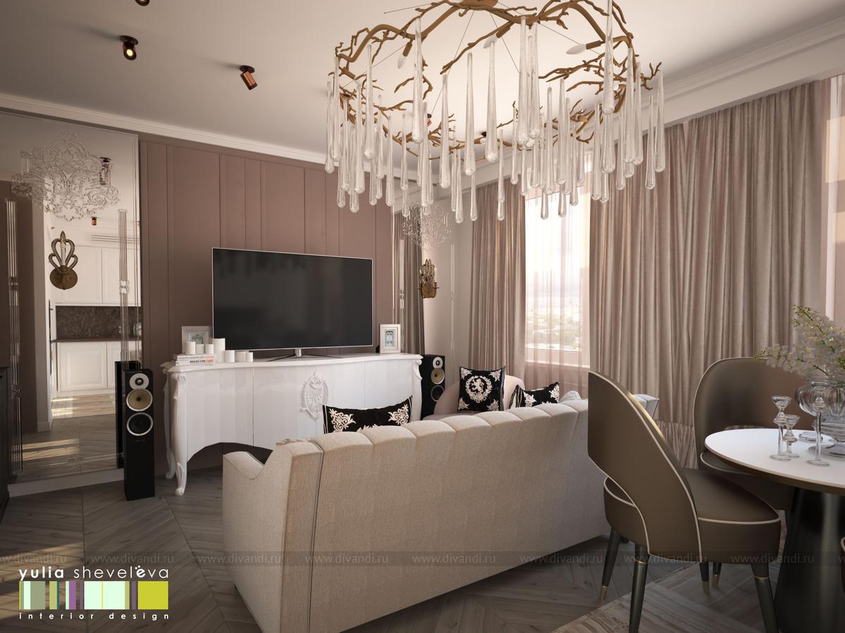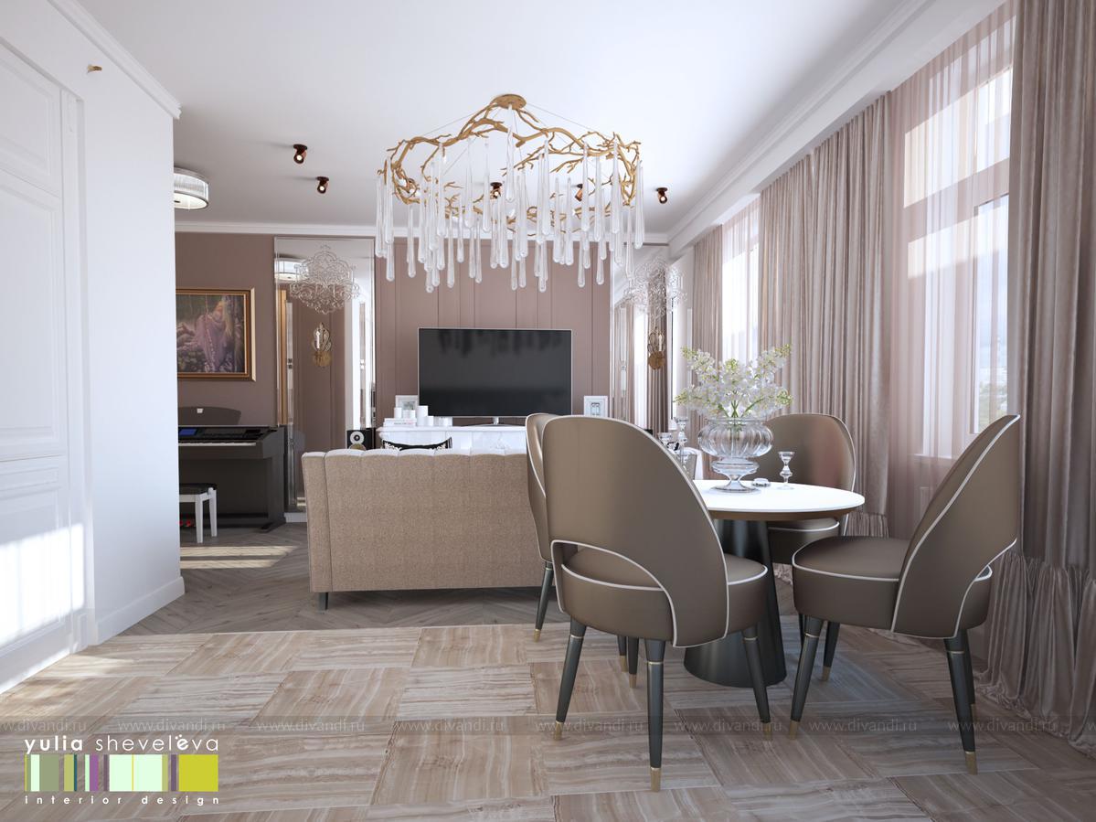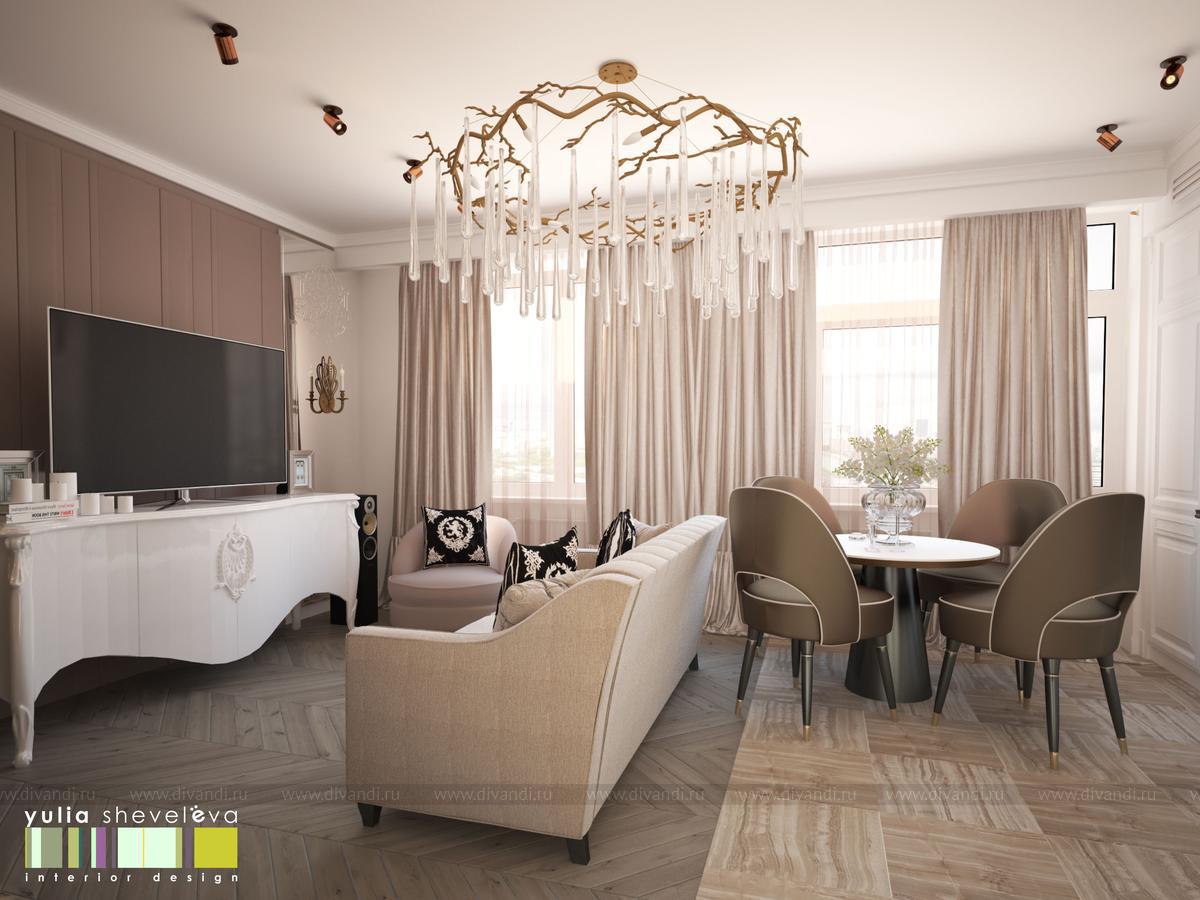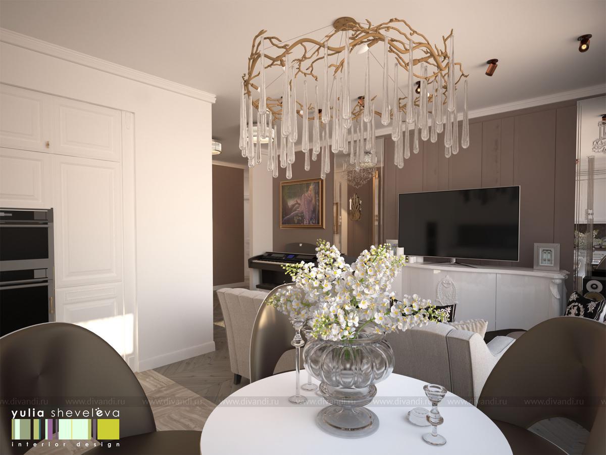 Гостиная - это салон для приема гостей. Здесь можно уютно устроится на диване, послушать, как играет хозяйка на фортепьяно. Нарядная кухня устроена в ниши, таким образом очень органично вливается в окружающее пространство. На полу - деревянный паркет, укладка французской елочкой. Стены украшены тканевыми панелями из нежной алькантары, за одной из них скрывается вход в хоз.блок. Центральное место в гостиной занимает люстра португальской фабрики Serip ручной работы.