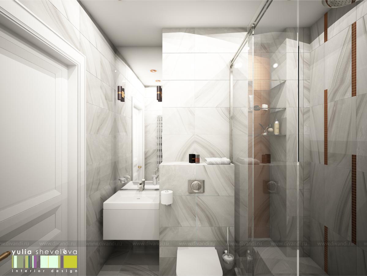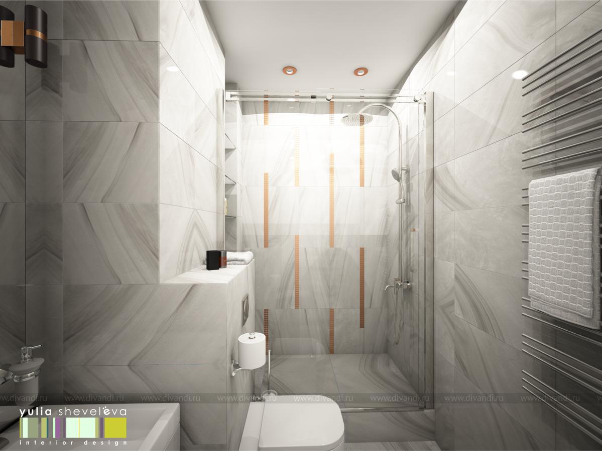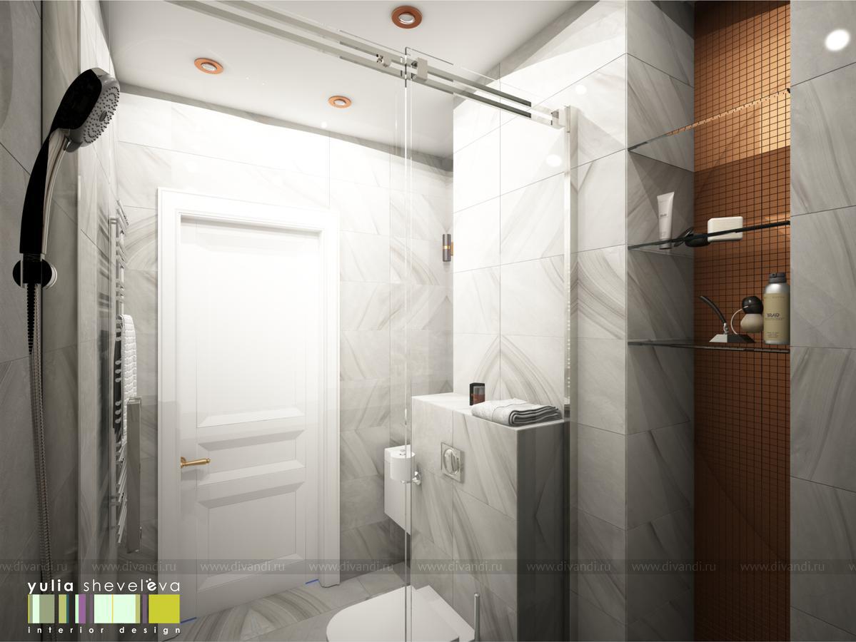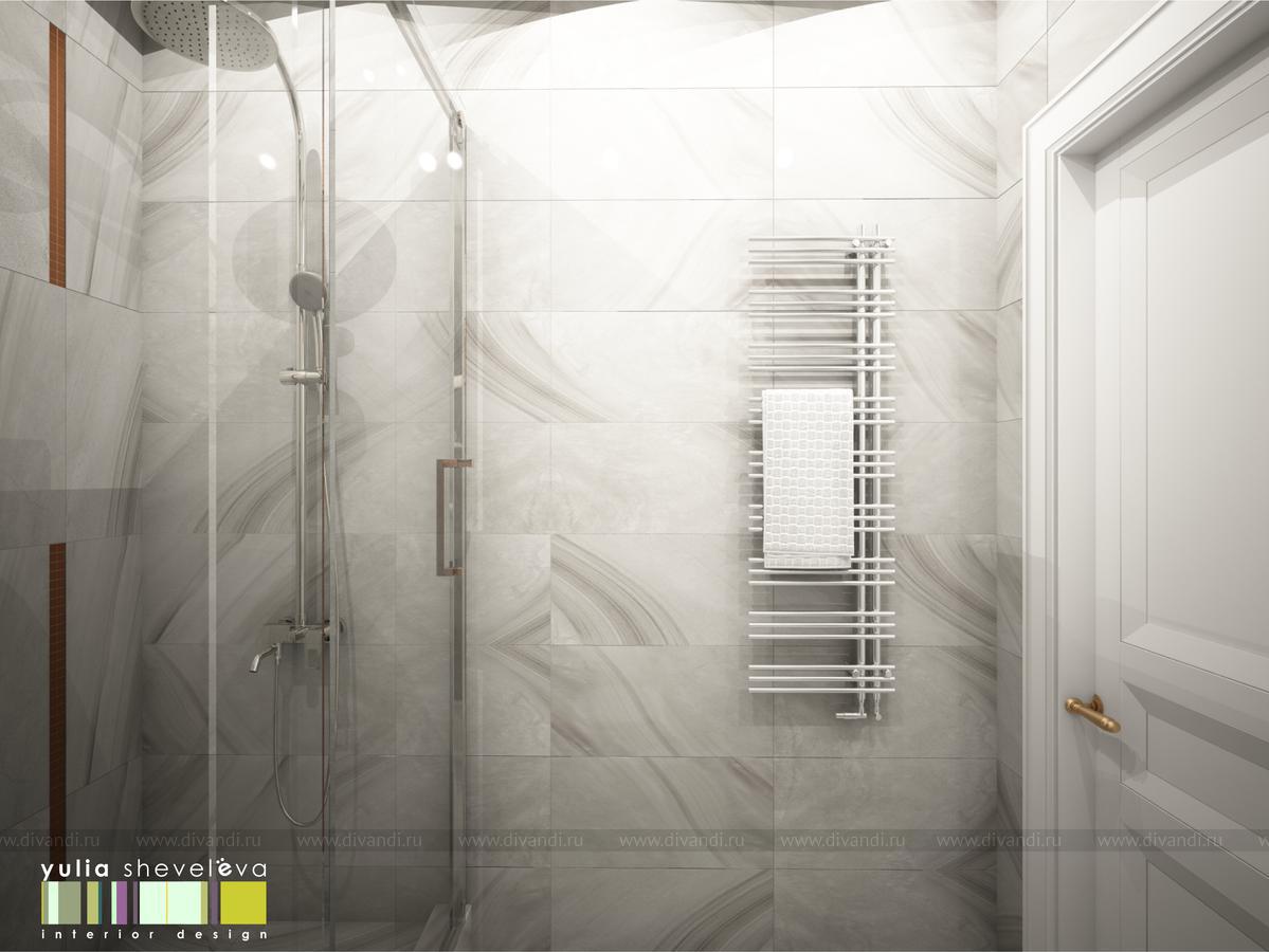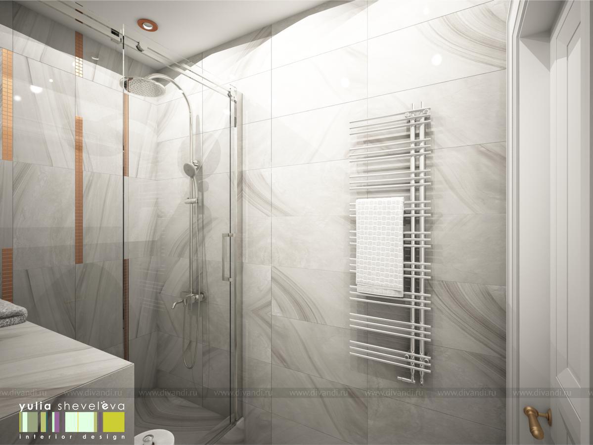 В ванных комнатах использована плитка Российской фабрики Italon. Ванную было пожелание сделать в теплой гамме с золотыми акцентами. Душевая напротив, более строгая, в серо-серебристой гамме, но прекрасным дополнением к ней стала медь.