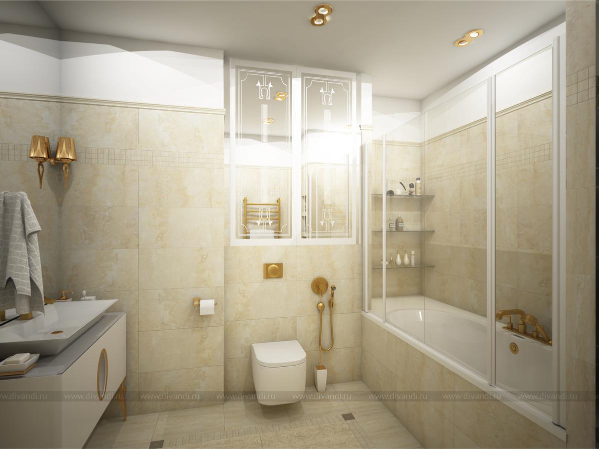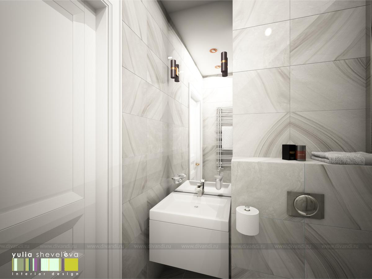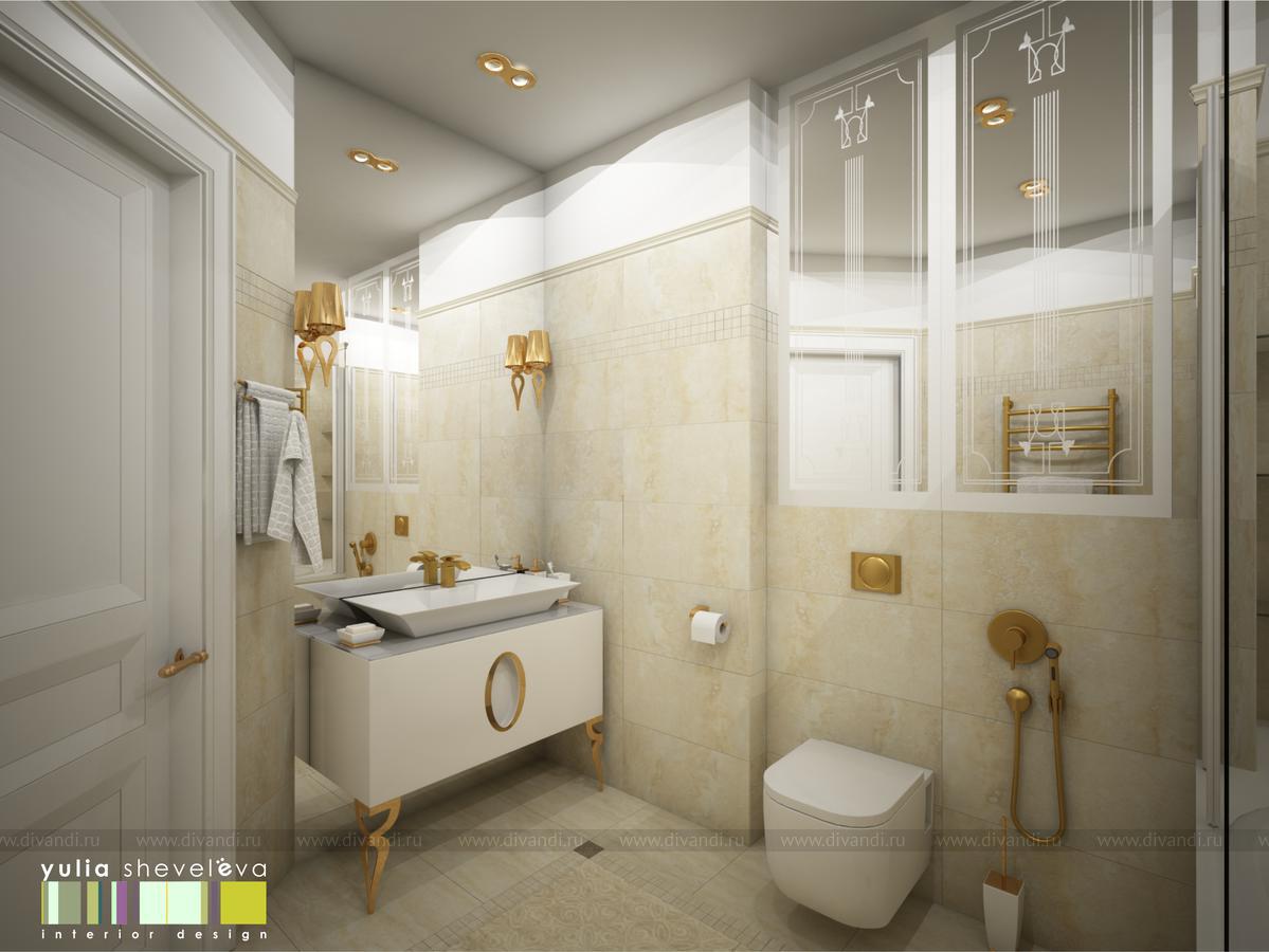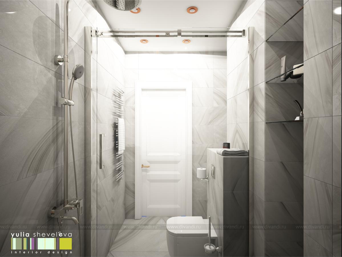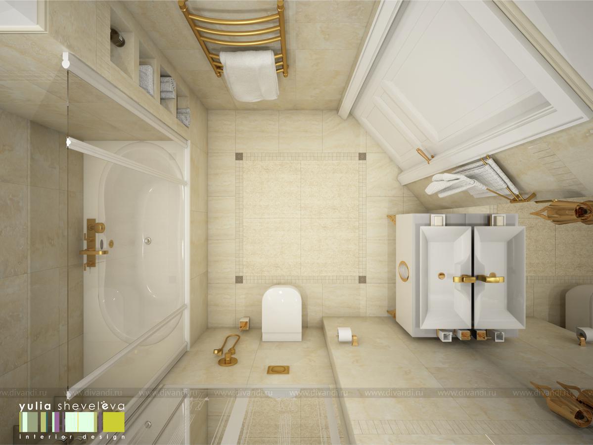 В ванных комнатах использована плитка Российской фабрики Italon. Ванную было пожелание сделать в теплой гамме с золотыми акцентами. Душевая напротив, более строгая, в серо-серебристой гамме, но прекрасным дополнением к ней стала медь.