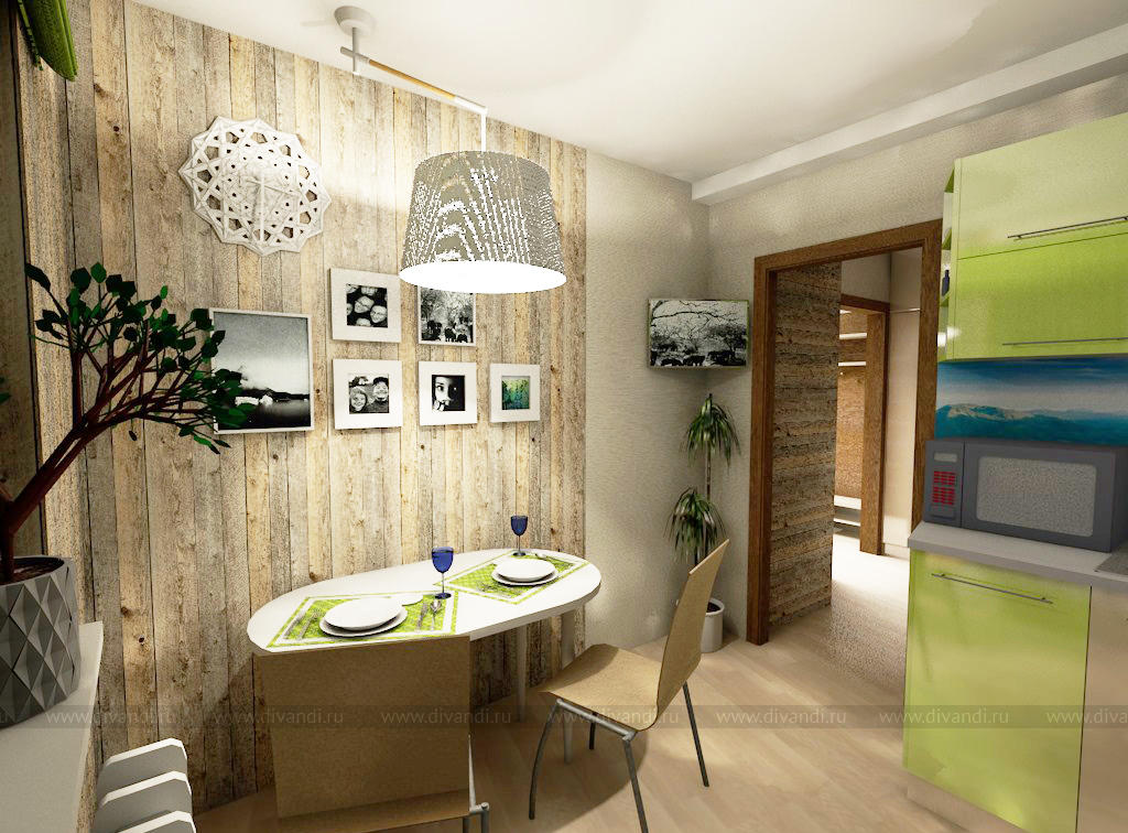Проект небольшой кухни, на которой удалось разместить компактный кухонный гарнитур со всем необходимым и обеденный стол. Сочетание бежевых фоновых обоев, акцентных "досок", и оливкового зеленого в фасадах кухни - поможет расслабиться и восстановить силы после рабочего дня)