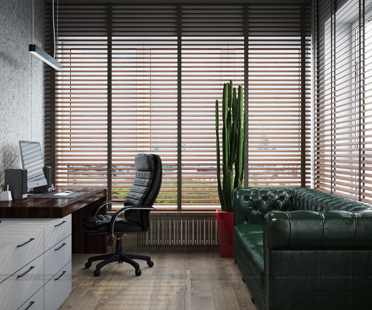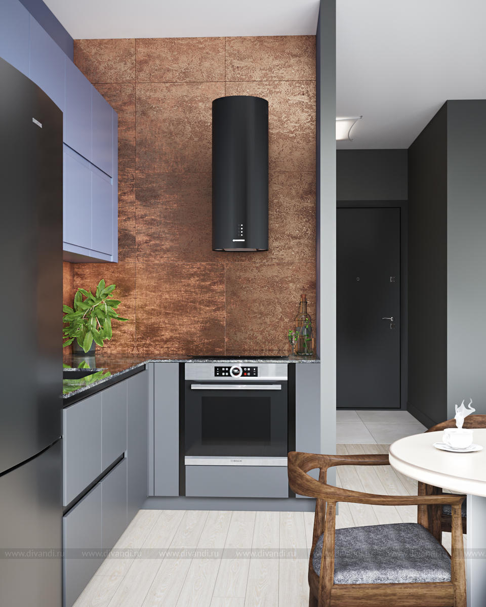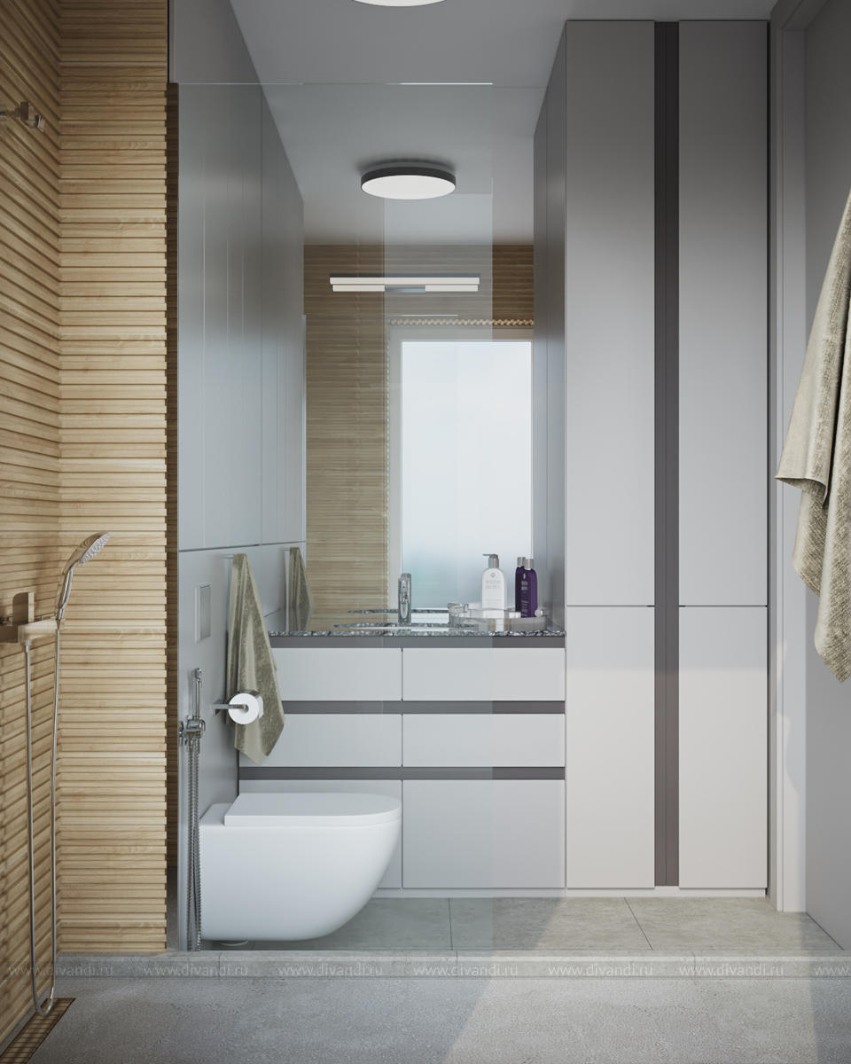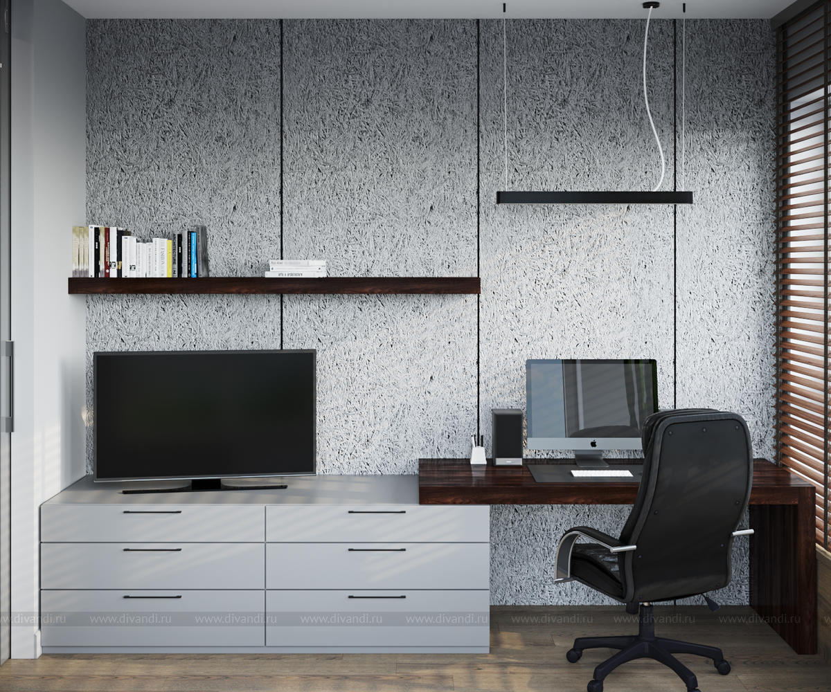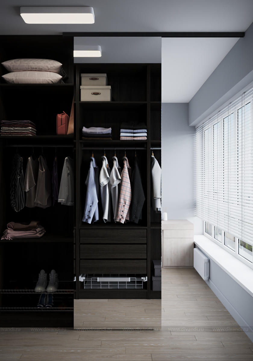 Общественная зона квартиры представляет собой открытое перетекающее пространство прихожей и кухни-гостиной, приватные же зоны скрыты от чужих глаз. Правая часть квартиры принадлежит хозяину квартиры и его увлечению игрой на электронной гитаре. Здесь же планируется проводить музыкальные вечера, поэтому спальня расположена в противоположной, тихой части квартиры. Гардероб размещен в отдельном помещении, чтобы один из супругов при переодевании не мешал другому отдыхать. За ним – кабинет хозяйки, которой для комфортной работы требуется длинный стол. Стандартную дверь между кабинетом и гардеробной не установить из-за окна, поэтому мы придумали откатную зеркальную дверь, которая решает сразу несколько задач.
