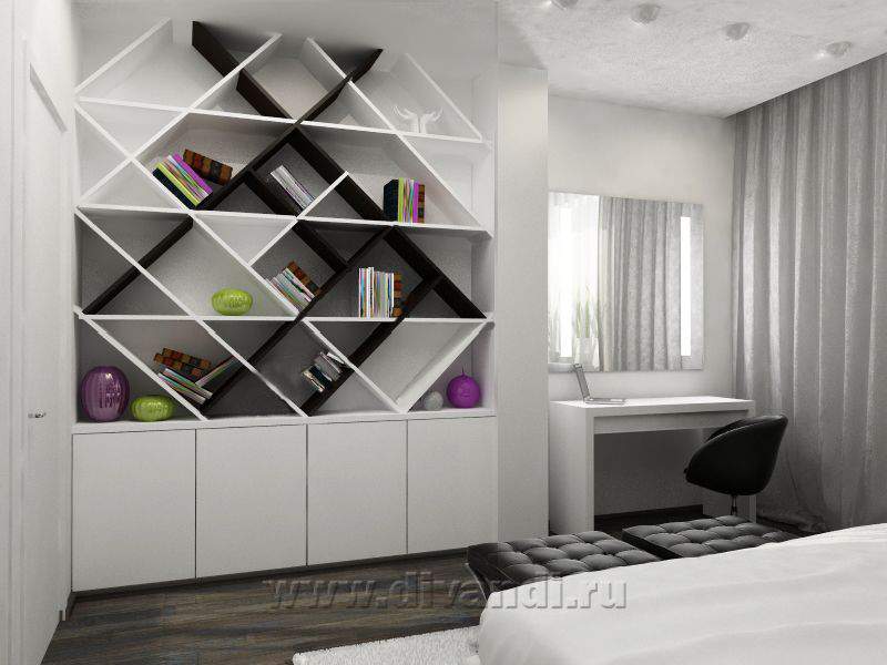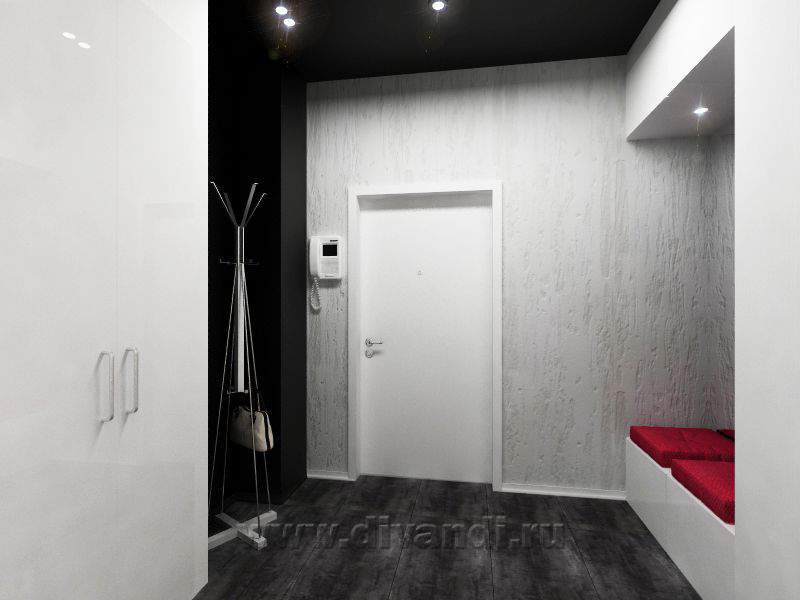 В квартире была большая и очень просторная спальня, а в одном из 2-х санузлов оказалось достаточно места, чтобы разместить там стиральную машину. Из минусов существующей планировки можно отметить вытянутую гостиную, колонну, а также большое количество выступов в прихожей. В результате прихожую дизайнеры всё же подвергли небольшой реконструкции: прихожая была отделена от гостиной благодаря установке перегородки, а также в прихожей убрали многочисленные выступы.