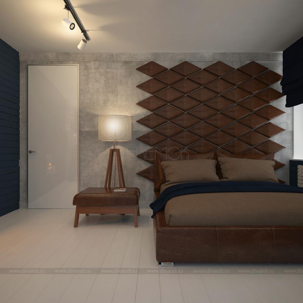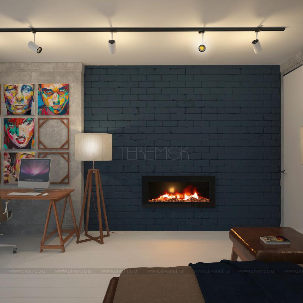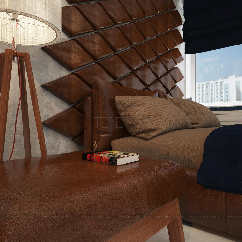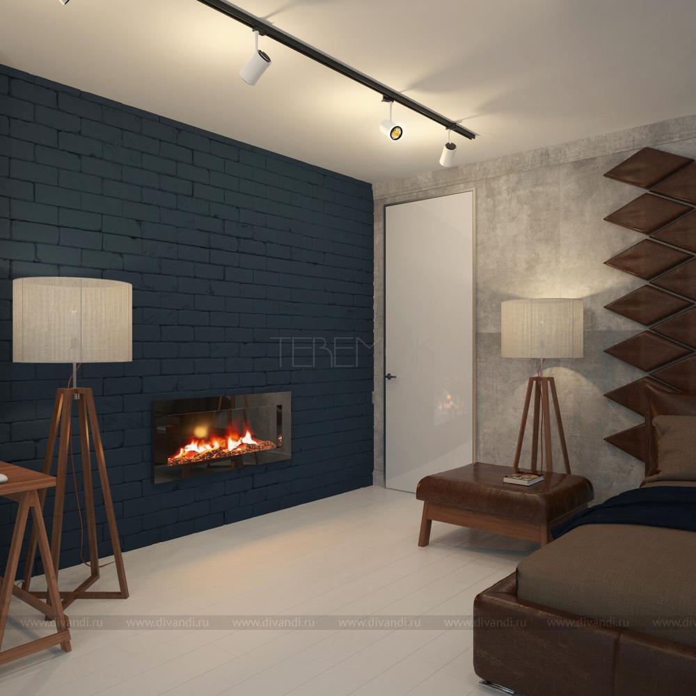 Этот интерьер изначально был задуман как гостевая спальня! Но в процессе работы над ним приобрел вполне полноценную рабочую зону и электрокамин. Изголовье кровати - индивидуальные кожаные панели в форме долек шоколада.