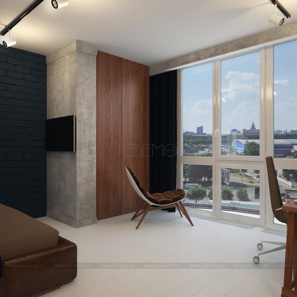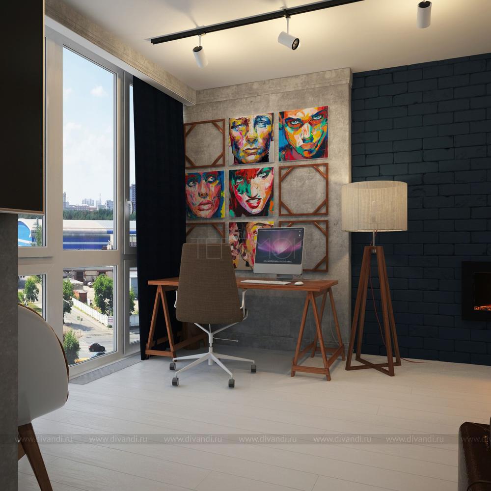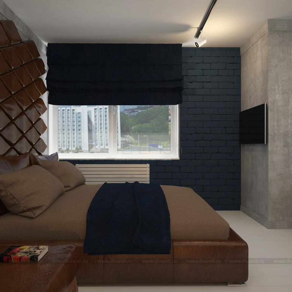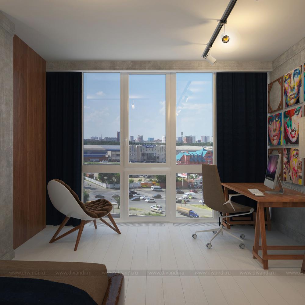 Этот интерьер изначально был задуман как гостевая спальня! Но в процессе работы над ним приобрел вполне полноценную рабочую зону и электрокамин. Изголовье кровати - индивидуальные кожаные панели в форме долек шоколада.