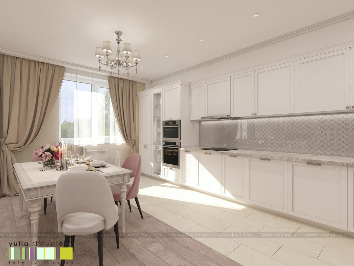 Интерьер выдержан в светлых тонах и теплой гамме. Преимущественно использованы кремовые и карамельные тона. Кухня объединена со столовой зоной и гостиной. Благодаря этому, получилось большое и красивое пространство.