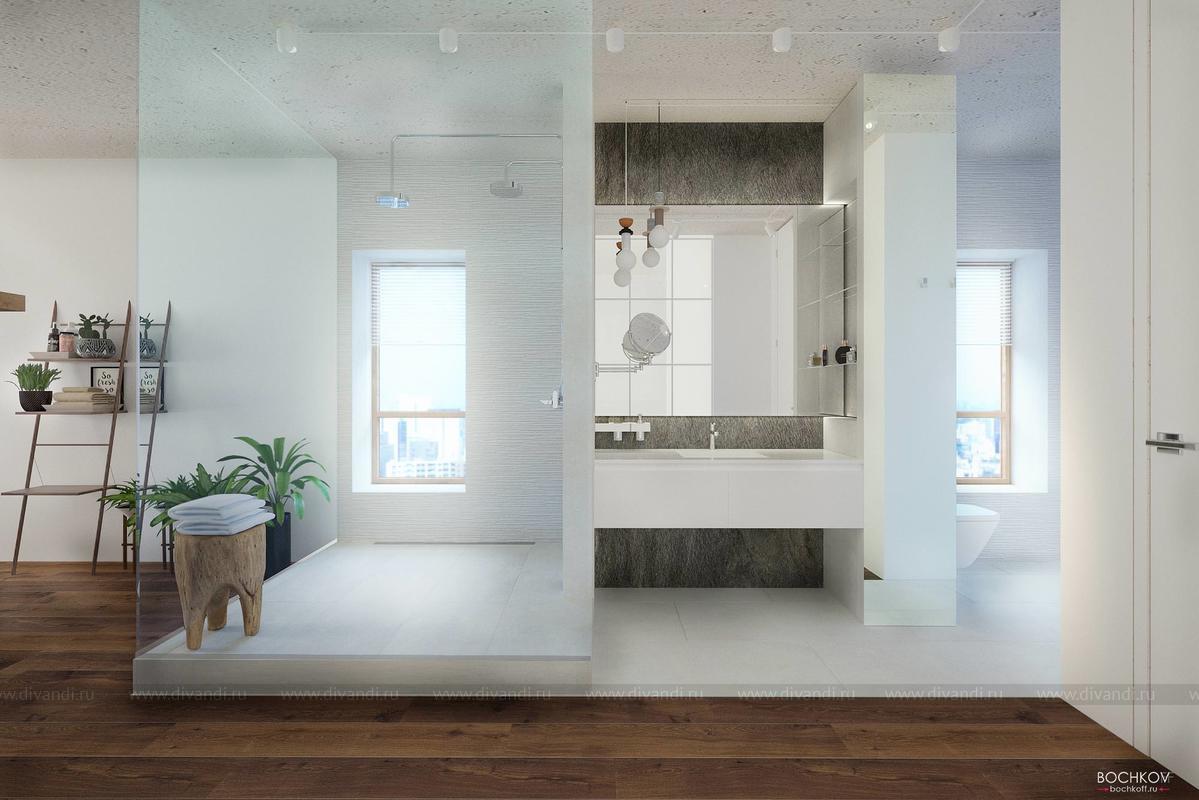 Необычное зонирование без перегородок санузла в мастер-спальне, душевая зона отделена стеклянными без рамочными перегородками от пола до потолка и смотрится стеклянным кубом.