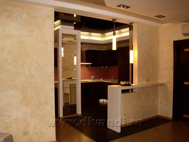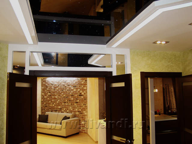 Черные потолки, "звездное небо", зеркальные порталы, четкая геометрия конструктивизма, немного урбанистики и хай-тека (куда без него)..., но получилось уютно.