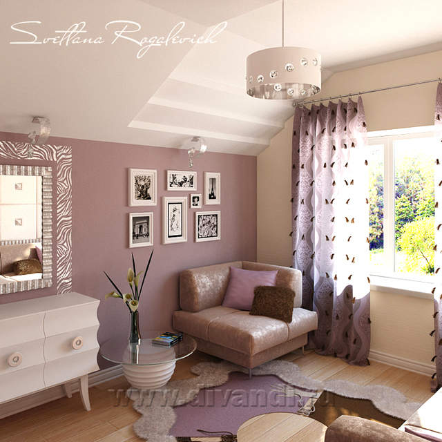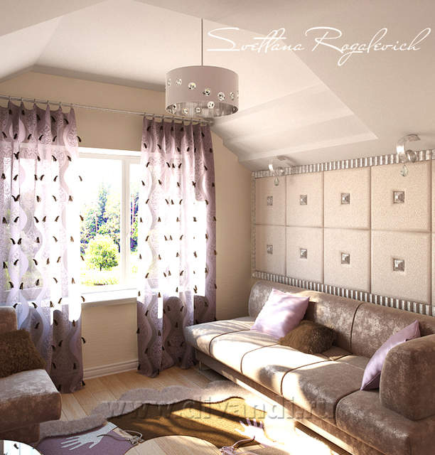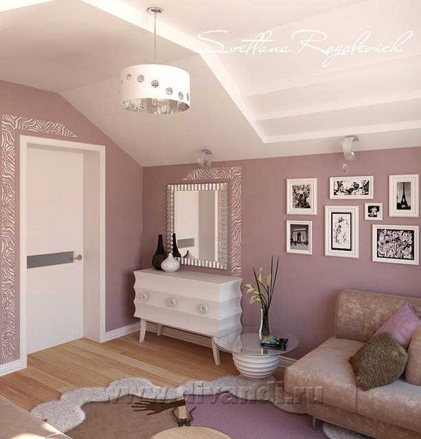 Небольшая по площади гостевая комната с интересными элементами декора. Форма потолка обусловлена конструкцией крыши.