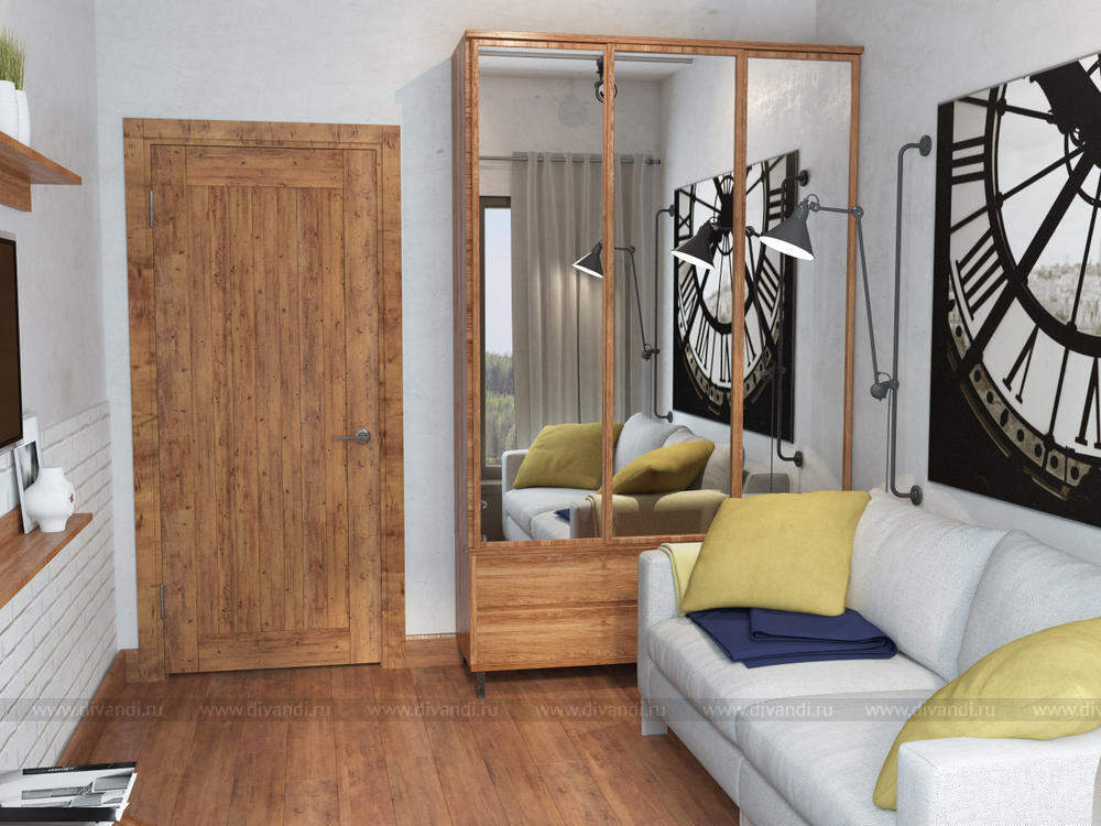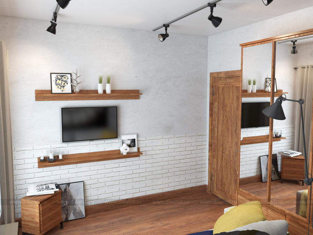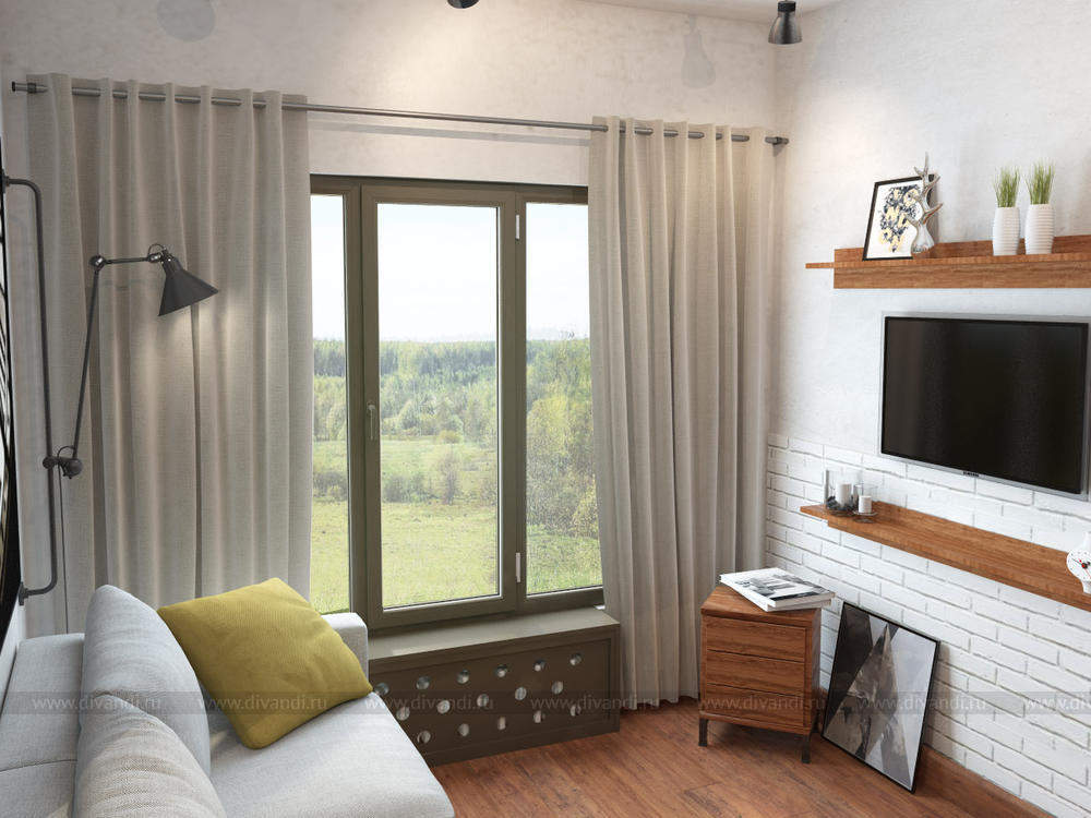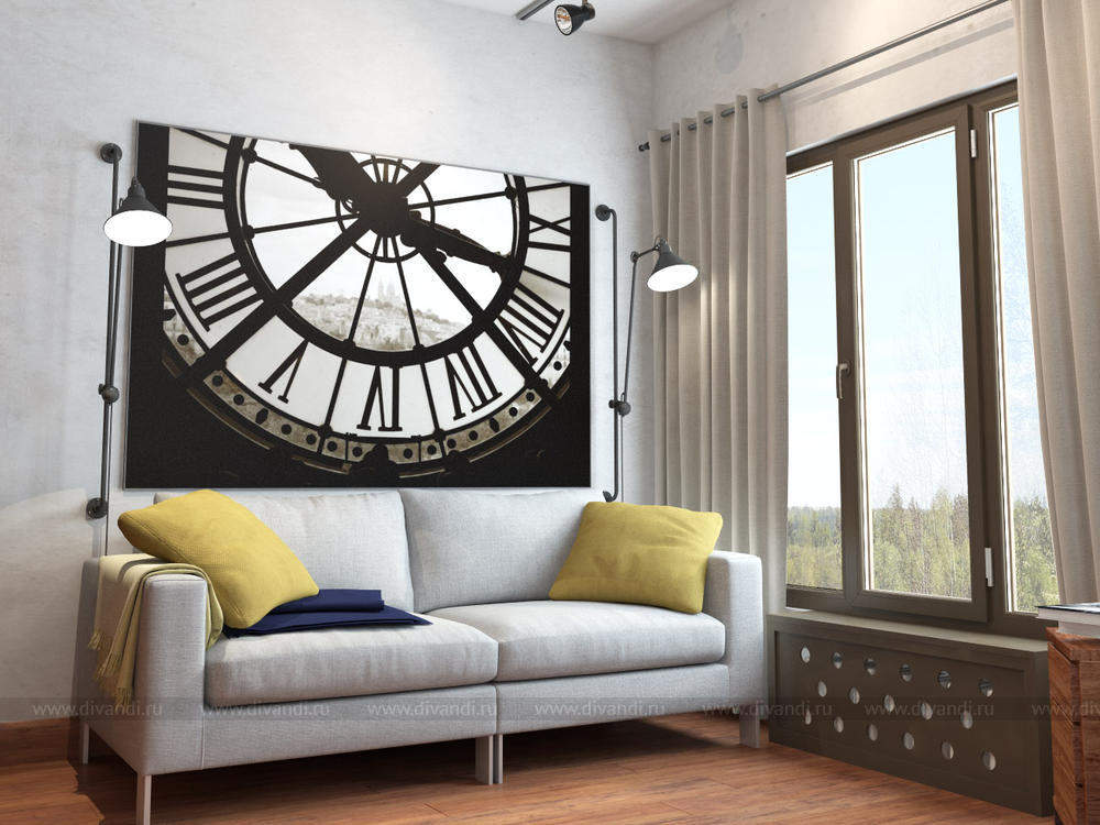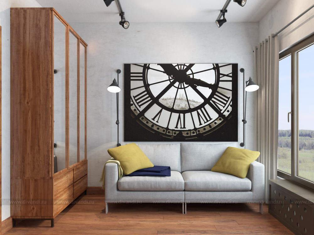 Гостевая комната будет расположена рядом с большой гостиной выполненной в стиле лофт, поэтому несмотря на небольшие размеры гостевой элементы стиля заказчик хотел сохранить. Чтобы не перегрузить интерьер деталями дизайнером было выбрано несколько активных акцентов, создавших настроение всей комнате – кирпичная стена и штукатурка, большая фото-картина, светильники, лаконичный диван с яркими подушками, свободное окно.