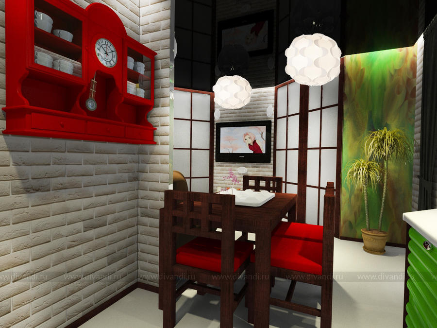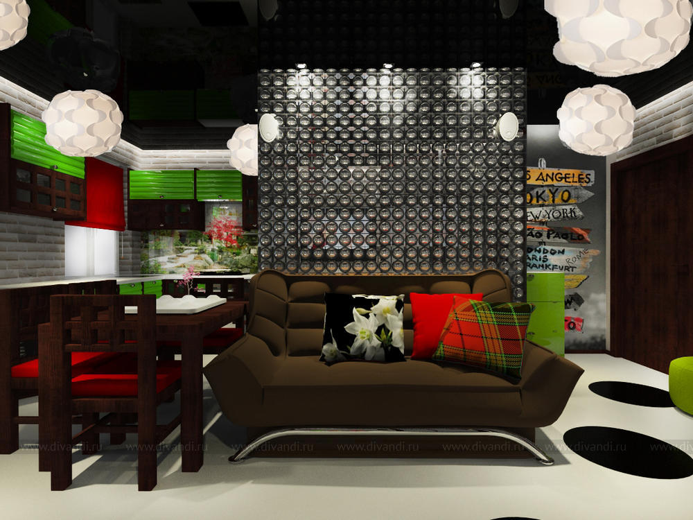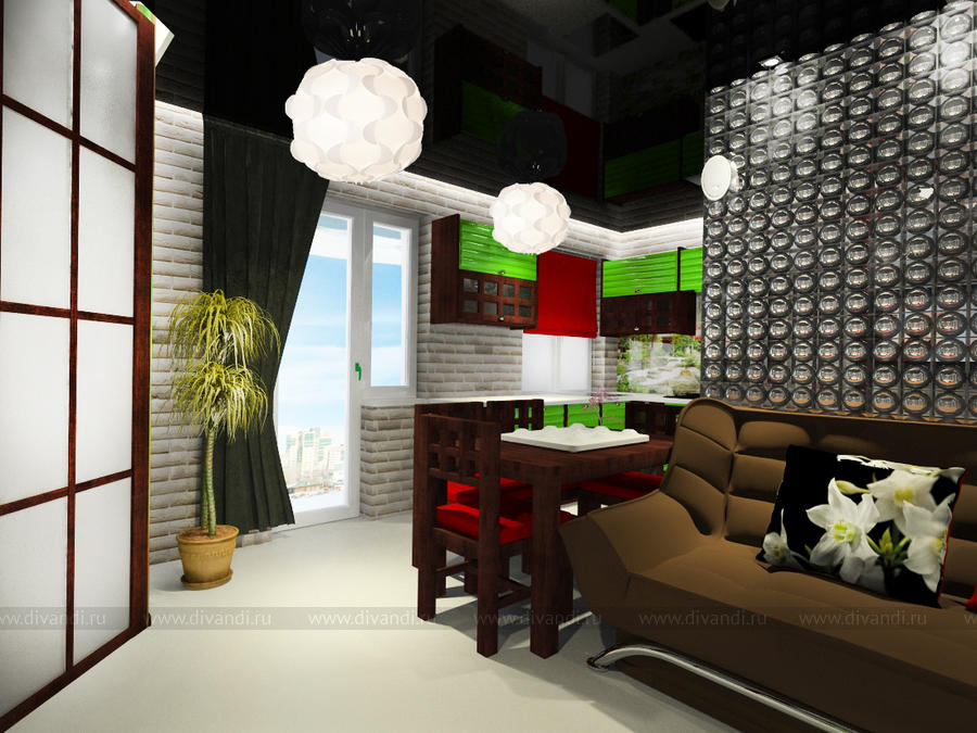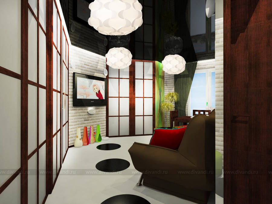 Нам предстояла задача рационально зонировать скромное по своей площади помещение - 44 м2. Когда нас пригласили на объект, то уже не было ни одной стены и необходимо было заново организовать отдельные спальню, детскую, прихожую, сан узел, кухню совмещенную с гостиной. При этом каждое помещение оформлено в разных эклектичных стилях и направлениях. Прихожая, гостиная и кухня сочетают в себе японский минимализм, поп-арт и легкий фьюжн. Для спальни выбраны спокойные кирпично-бежевые тона и задана греческая тематика при помощи декоративного покрытия стен и оформления их полуколоннами. Детская для 9-ти летнего мальчика задумана в космической теме, что выражается в большом постере Планета Земля на стене, потолке имитирующим звездное небо, а также светильниках на шинах. Санузел создан по мотивам картины испанского художника кубиста Juan Manuel Sánchez.