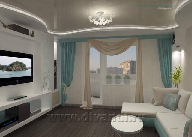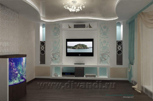 Площадь помещения 18 м.кв., учтены все пожелания заказчика по функциональному наполнению (домашний кинотеатр, аквариум, пузырьковая панель и общая расслабляющая обстановка). Было предложено несколько вариантов, вы видите утвержденный. На правой стене от входа располагается кондиционер – картина. Предложена сложная конструкция аквариума с пузырьковой панелью, за нее задвигается входная дверь при открывании. Проект реализован.