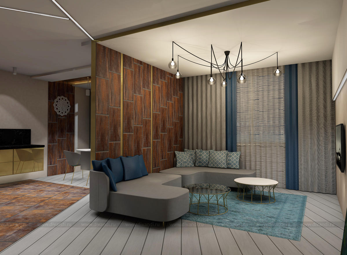 Разработка интерьера квартиры для молодой семьи с 2-мя детьми началась с перепланировки. Демонтаж перегородок между кухней, гостиной и прихожей, позволил максимально увеличить «общественную зону» квартиры за счет неиспользуемой площади коридора. Подиум с мягкими подушками в гостиной – это место отдыха, в котором комфортно играть в настольные игры всей семьей или уединиться с ноутбуком. Шоколадные, охристые оттенки создают атмосферу уюта в этом «гнездышке», а естественный свет, отражаясь в зеркалах, зрительно увеличивает объем.