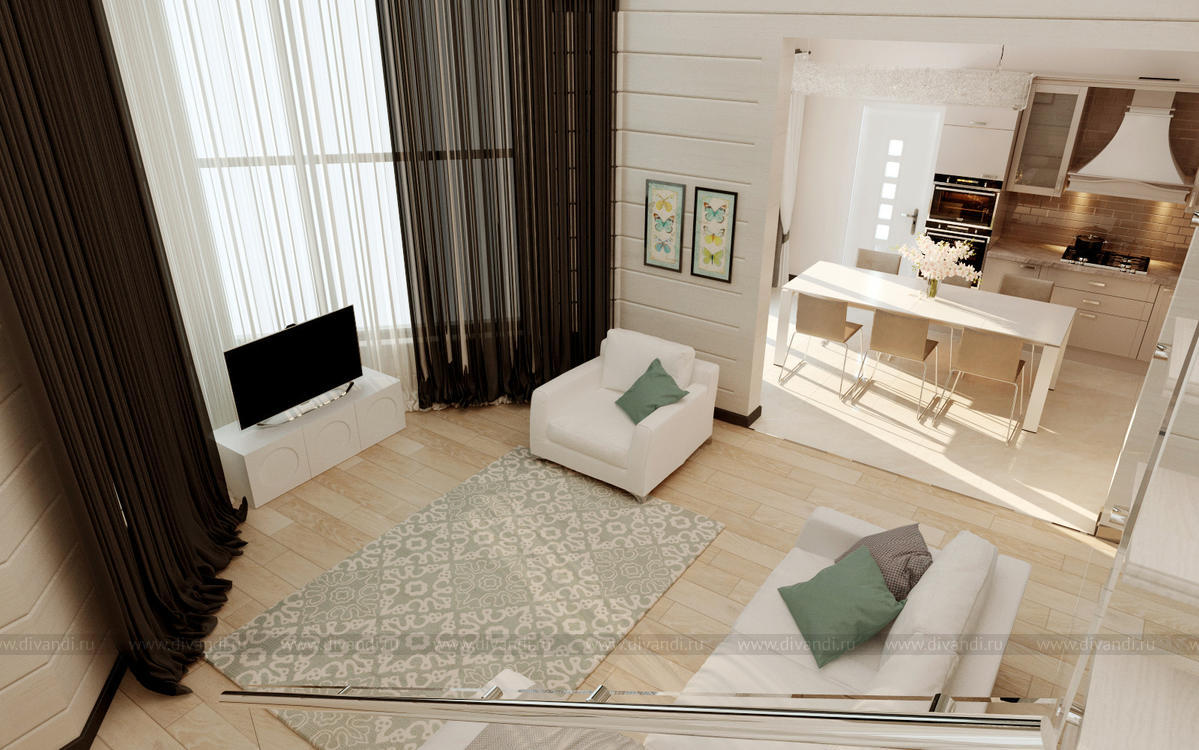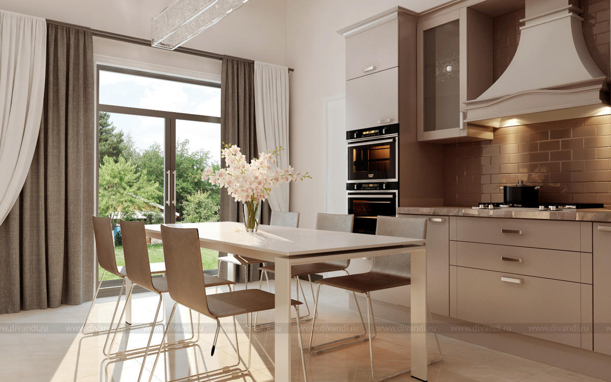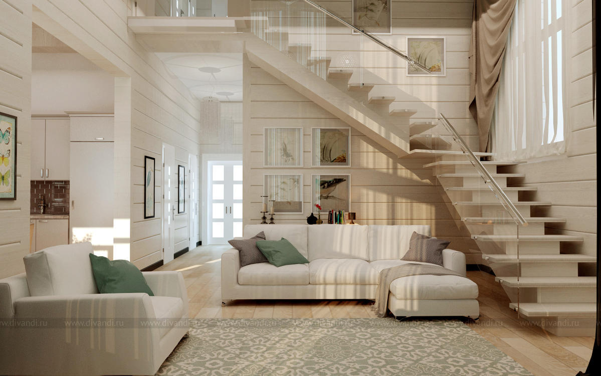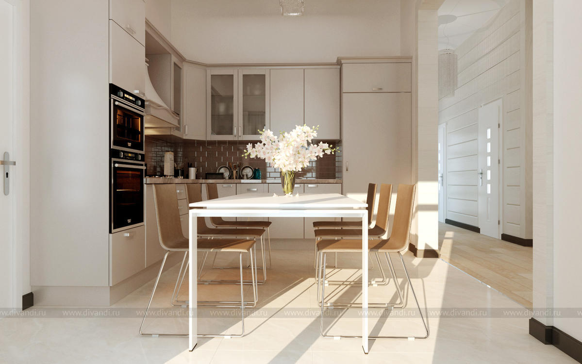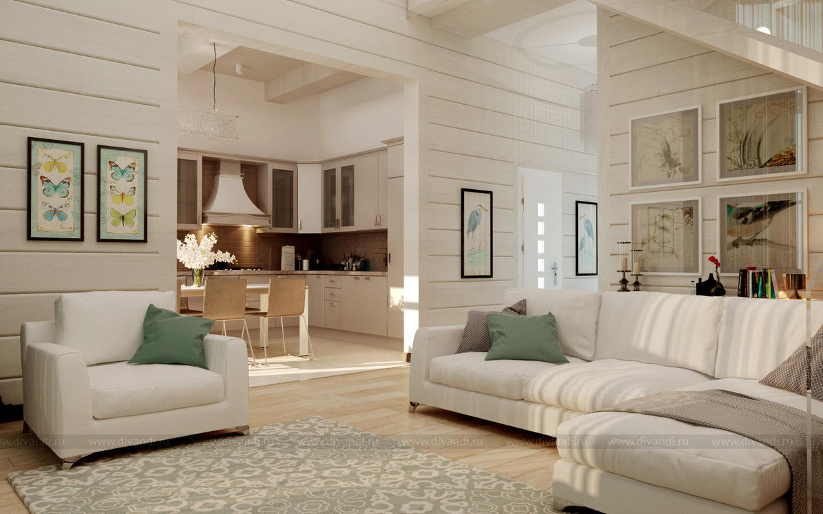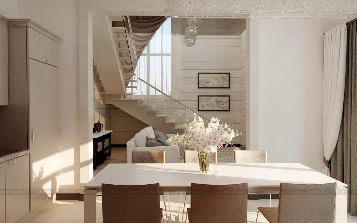 Интерьер гостиной и кухни-столовой в загородном доме В проекте было главным создать теплый уютный интерьер в доме залитым солнцем для отдыха всей семьей после рабочих будней.