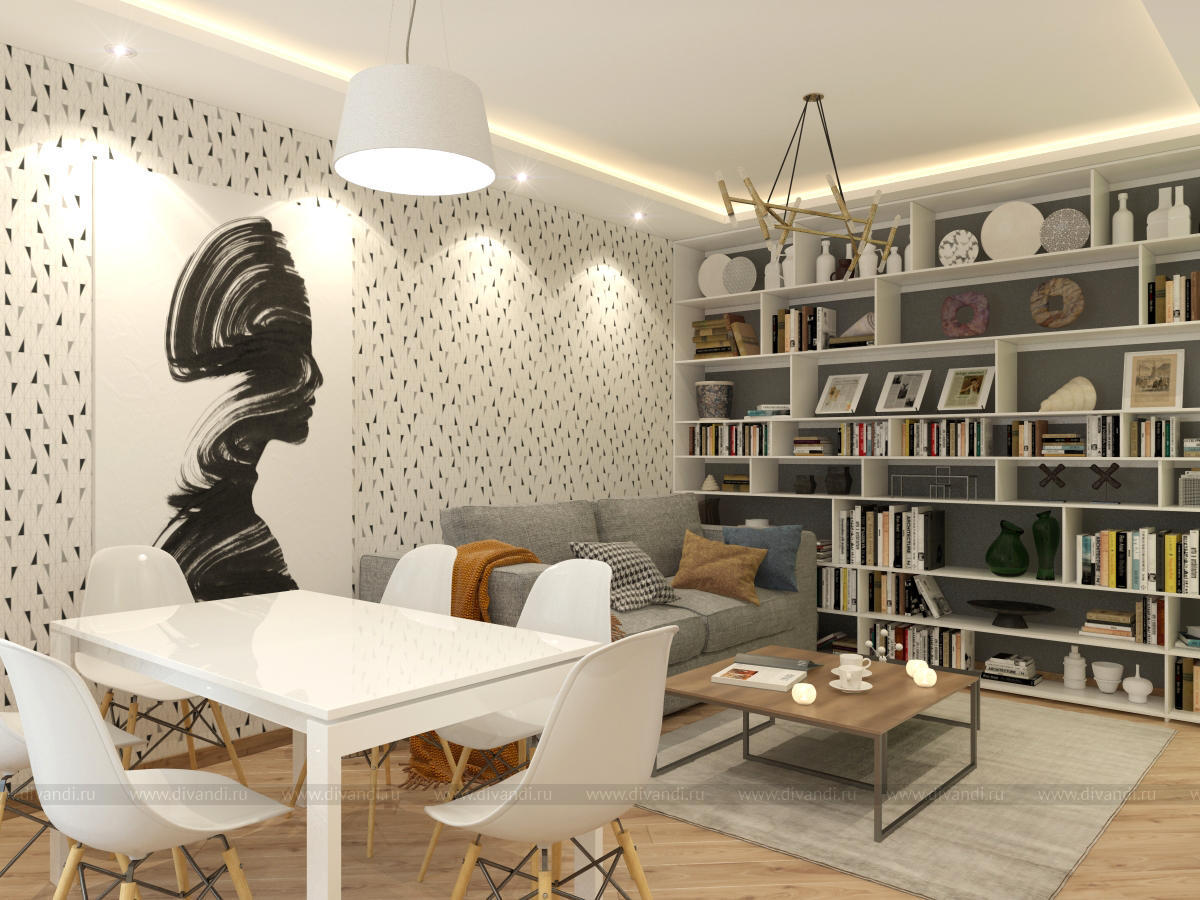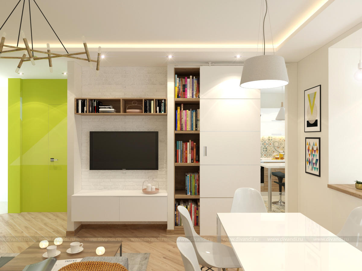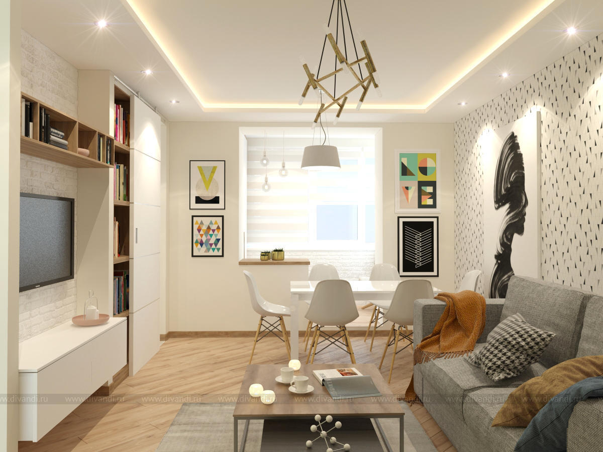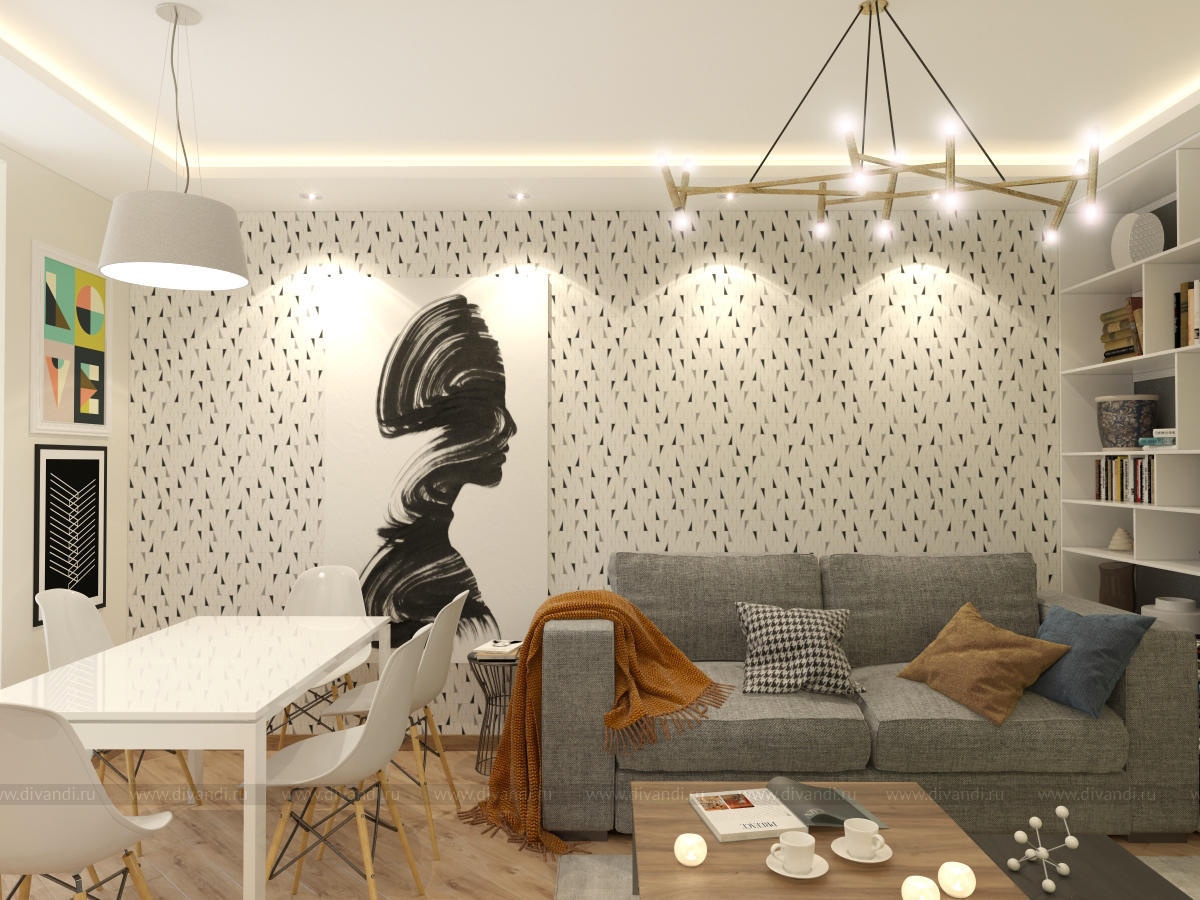 Гостиная и кухня в скандинавском стиле в городе Москва.