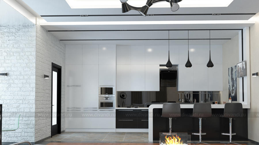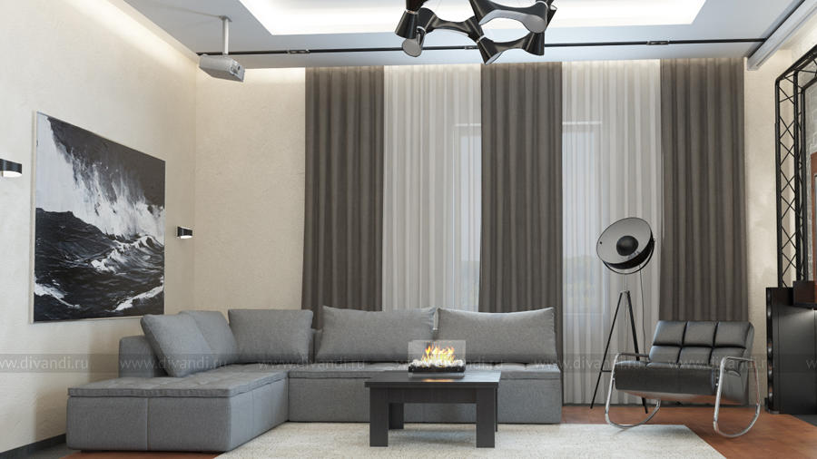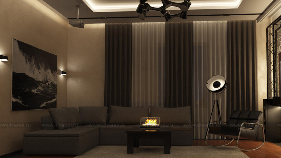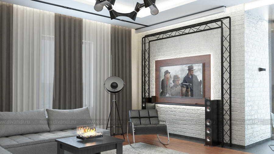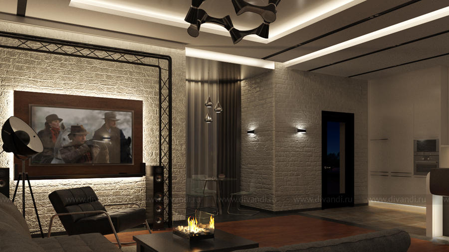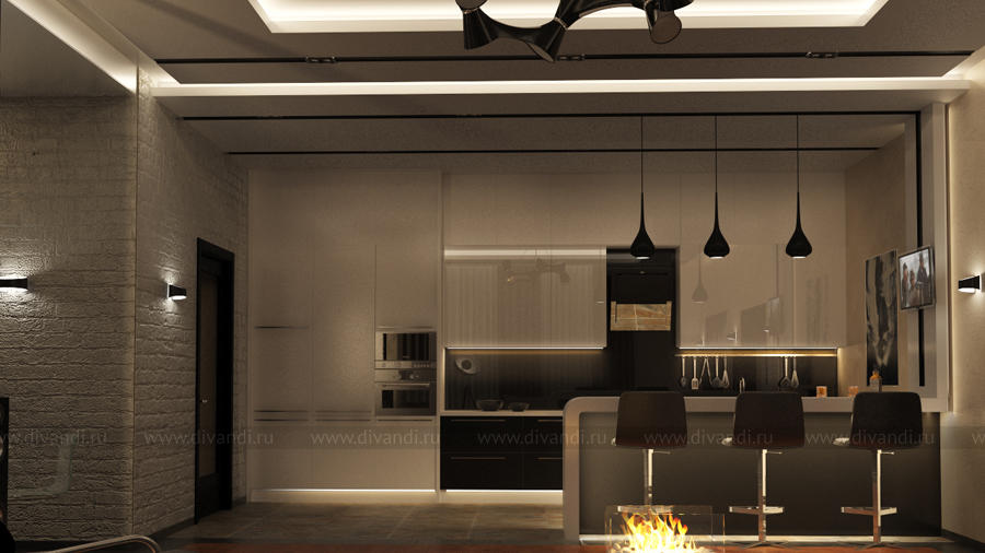 Большое пространство совмещенной гостиной и кухни, визуально поделено на две зоны – кухню и гостиную. Деление поддержано сложным многоуровневым потолком с регулируемой подсветкой. Небольшой обеденный стол на двоих хорошо вписался в зону эркера. Мужской характер в интерьере подчеркнуты материалами отделки. Одна стена оставлена в грубом кирпиче и просто покрашена, пол в зоне кухни выложен керамогранитом под камень с вкраплением текстуры железа и ржавчины, цветовое решение для кухонной зоны – глянцевые черно-белые фасады. В контраст, чтобы смягчить интерьер, для зоны гостиной выбран приглушенный теплый серо-коричневый цвет, на стенах использована декоративная штукатурка с текстурой «шёлк», деревянный пол. Из деталей только современные светильники, обилие подсветок, сценические стойки в зоне телевизора. Интерьер получился современным и комфортным.