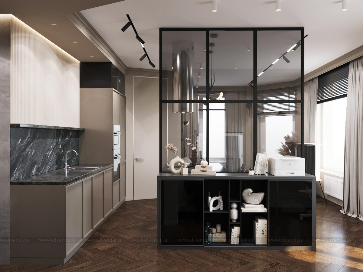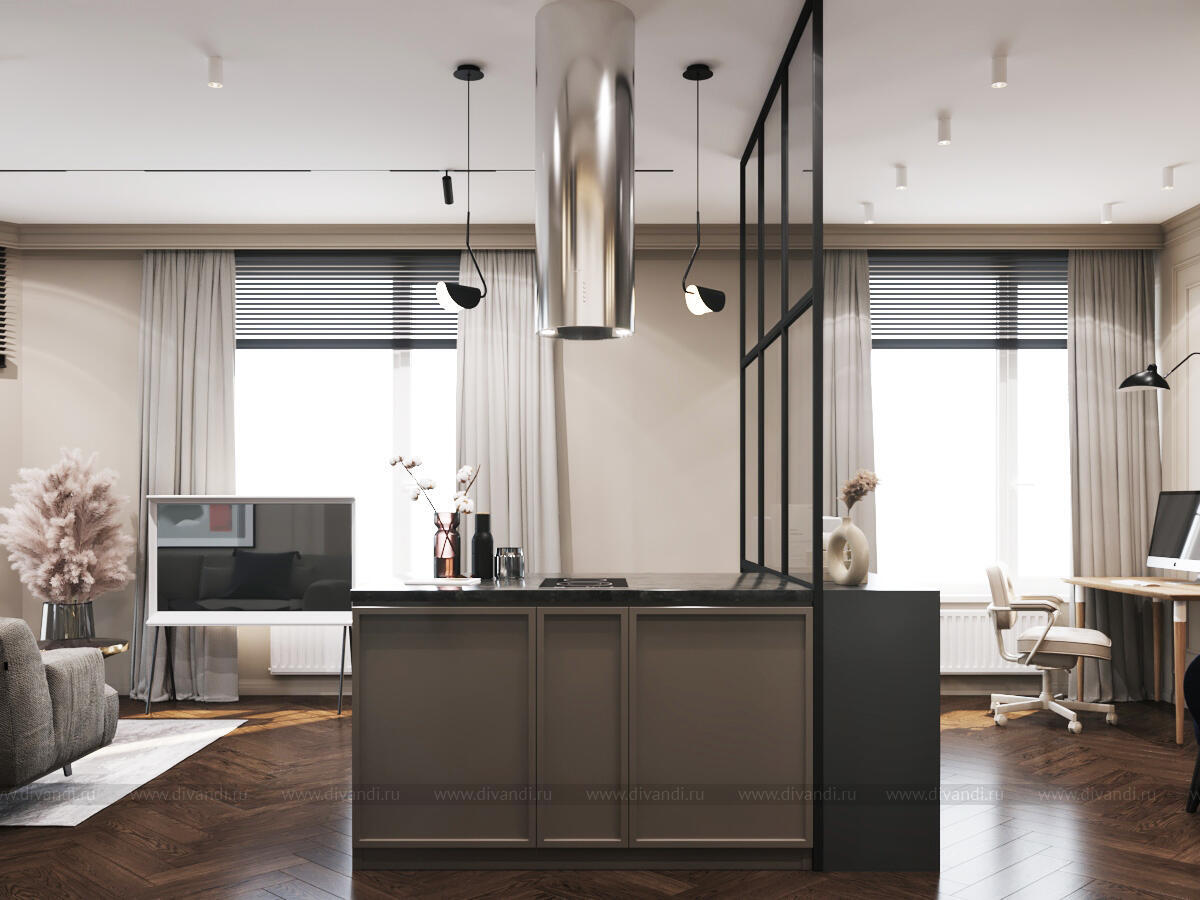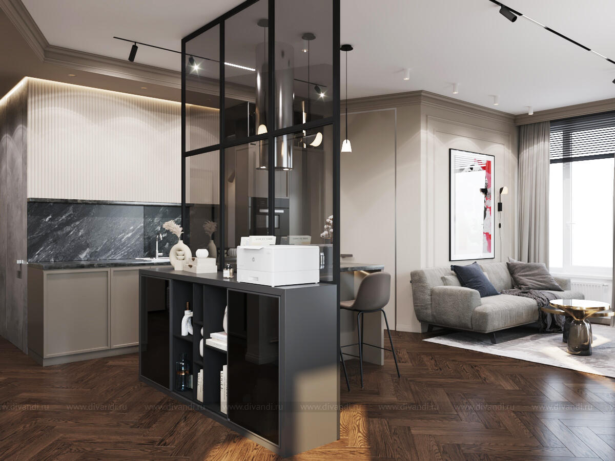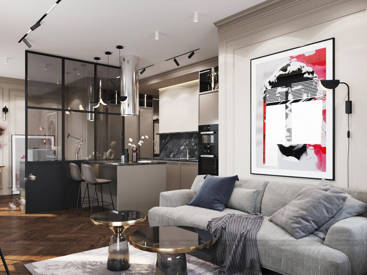 Сделали визуализацию открытого пространства гостиной-кухни! В каждом новом проекте вся стилистика квартиры всегда определяется характером его жильца. Интерьер получился строгим , но при этом уютным и спокойным, но местами "бодрящим". Квартира в Жк "NOW" г. Москва.