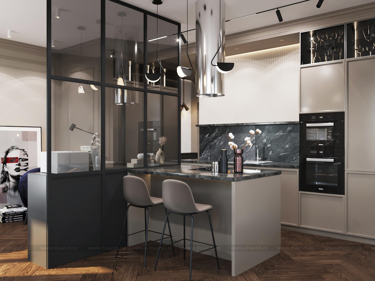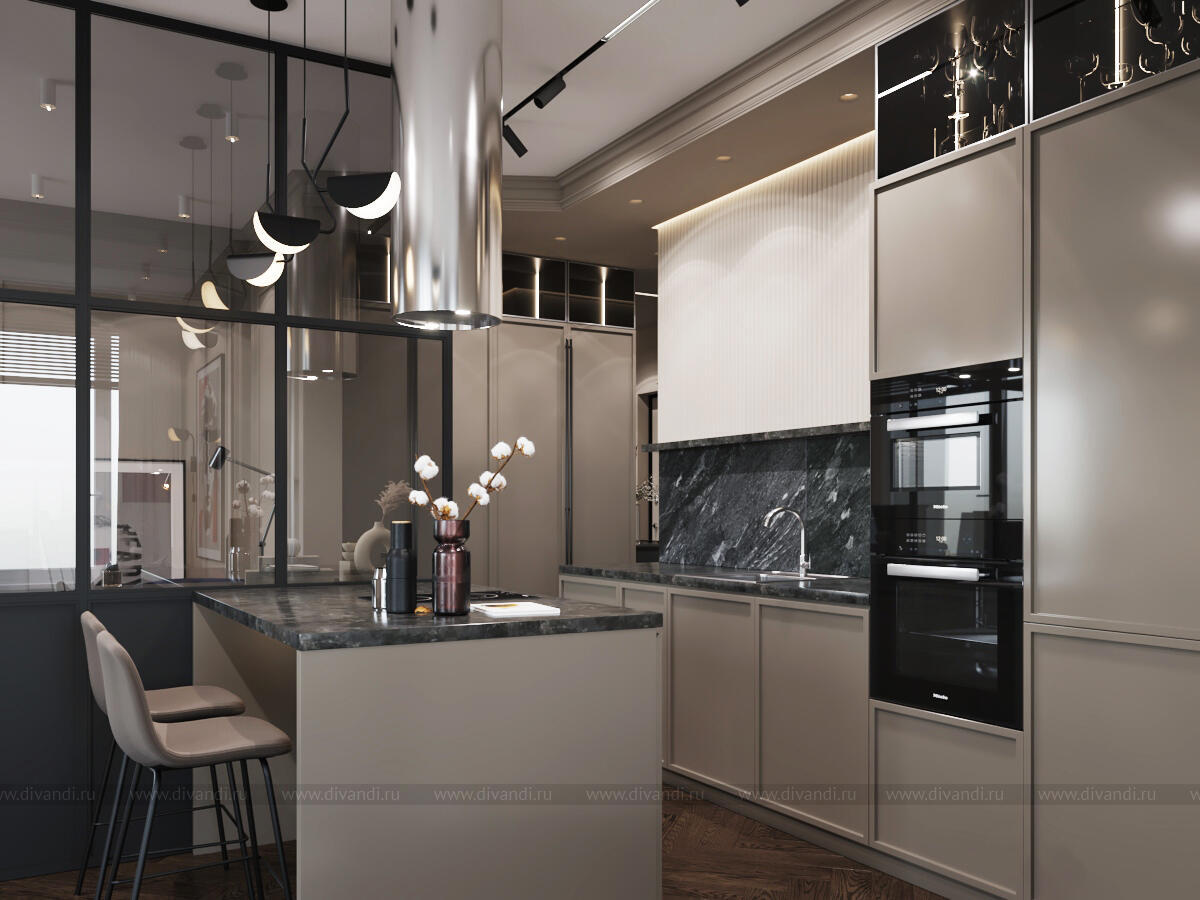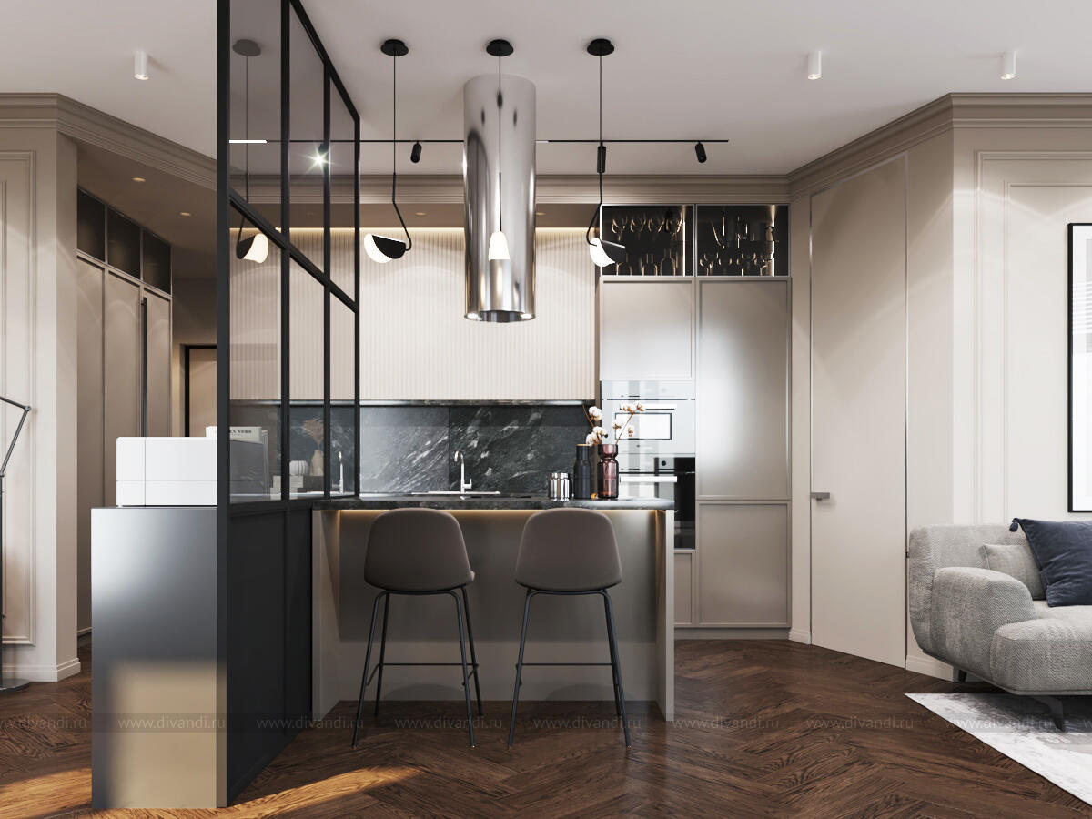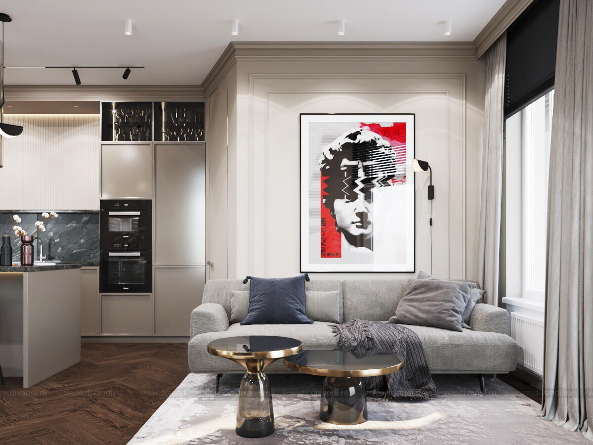 Сделали визуализацию открытого пространства гостиной-кухни! В каждом новом проекте вся стилистика квартиры всегда определяется характером его жильца. Интерьер получился строгим , но при этом уютным и спокойным, но местами "бодрящим". Квартира в Жк "NOW" г. Москва.