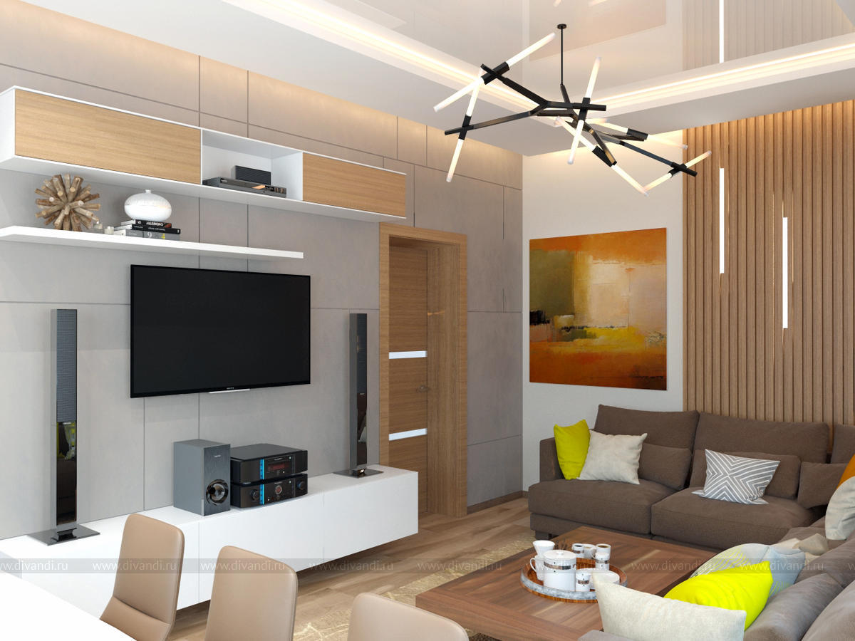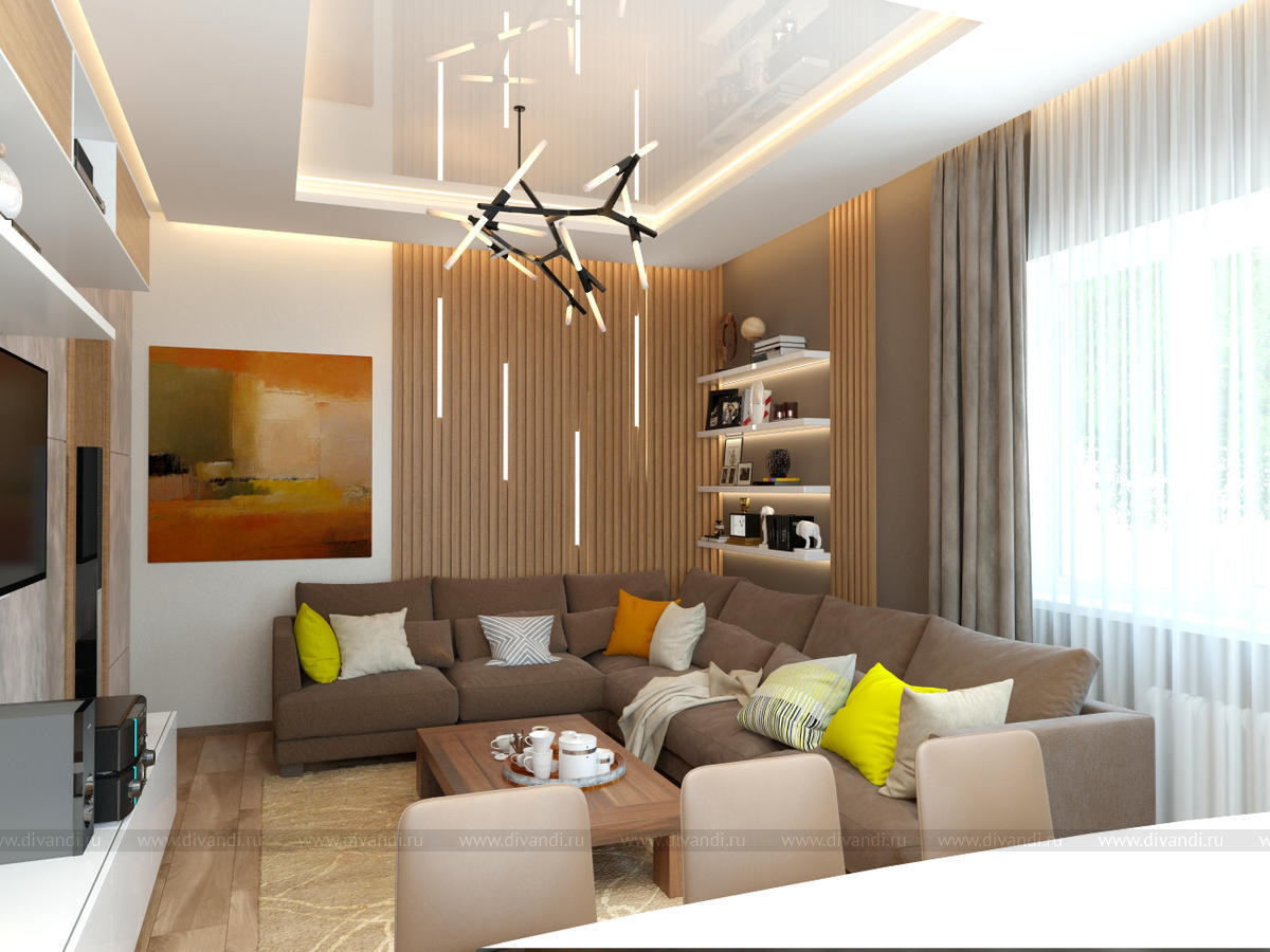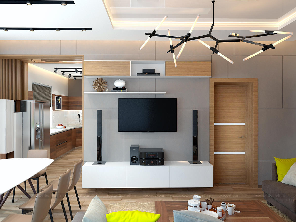 Гостиная и кухня объединенные одним пространством в тёплых светлых тонах с яркими акцентами.