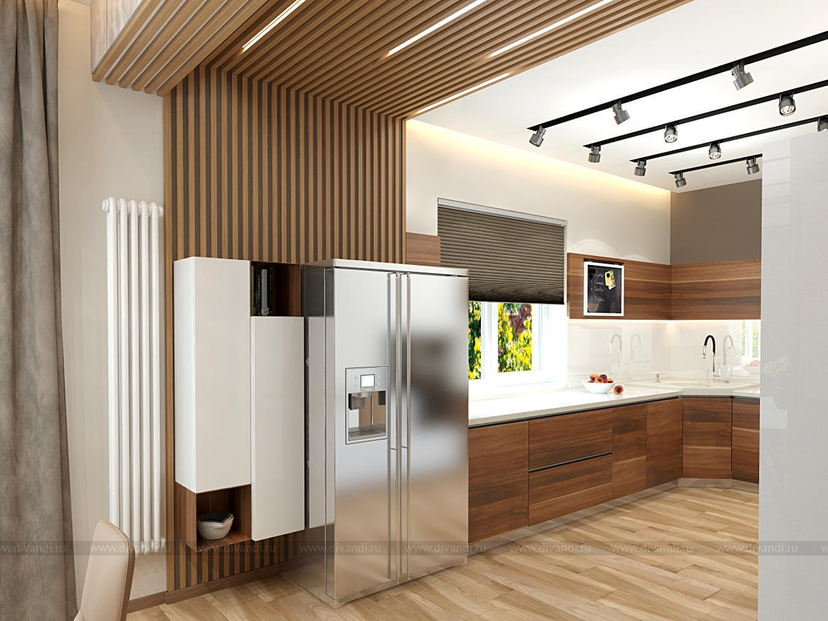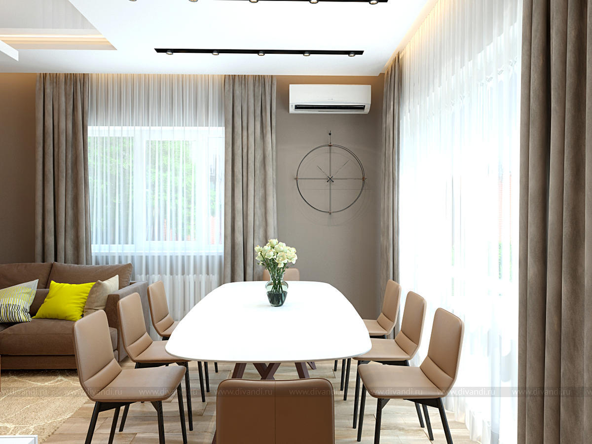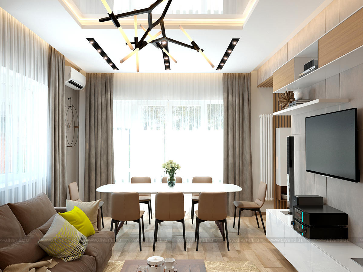 Гостиная и кухня объединенные одним пространством в тёплых светлых тонах с яркими акцентами.